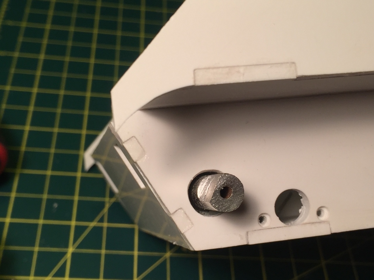 This is a rear view of the mounting plate for the gearbox, at quite an unusual angle. It is made of leftover plasticard from the kit sheets. The plate will be reinforced later.