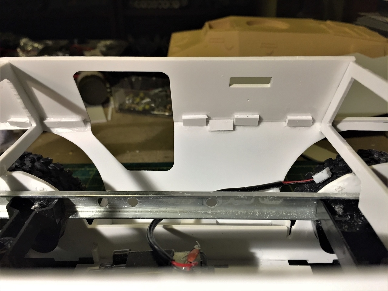 I thought it made sense to put braces made of leftover plasticard in order to reinforce the hull joint. You do not want the hull to crack open at the first bump on a wall.