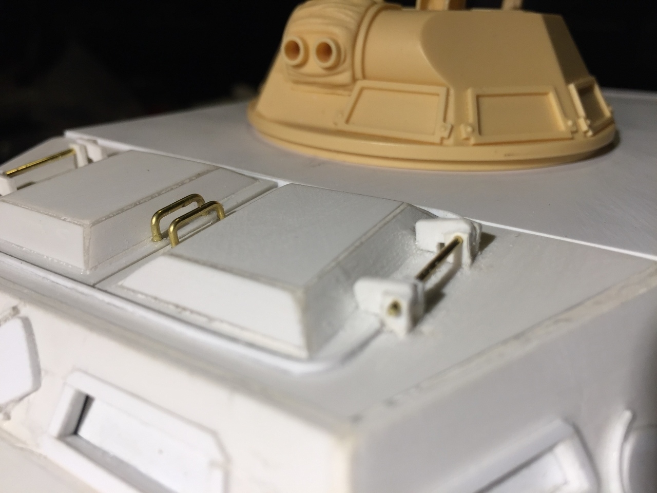 Those hinges need to be reduced by about half in size and are now at scale but very fragile. It is not a toy so opening the hatches must be done very carefully. Guys that are efficient at building metal parts would likely create metal hinges and laugh at my little hinges that will not last long. I hear you. All pre-drilled holes (periscope, hinges) needed to be filled because they were not at the right location. This door has a lot of angles and a bit complicated to align.