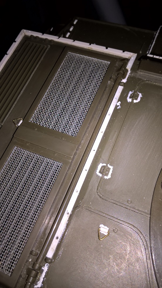 Next to sort out are the side frames that hold the side armour. To get the right profile each cross piece is made of two lengths of plastic strip cut from sheet and rounded on the edges. Lots of reference to original photos for all this. There were they think about 8 Enigmas built all slightly different. The spatial armour is made out of armour plate layered with rubber between, in some cases it was found to have had no rubber fitted which points toward a lower tech manufacturing process not quite back street garage but certainly not high end engineering. The exhaust cover is welded on and the weld detail is added. I've drilled out the holes in the exhaust port which is used to