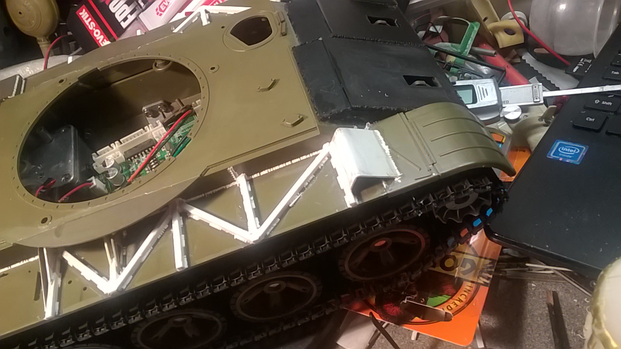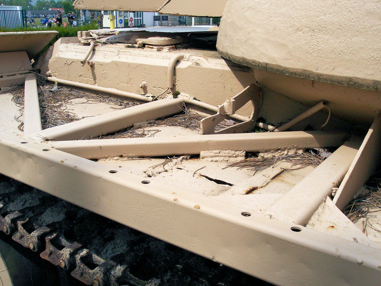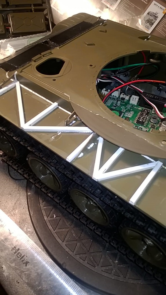 The front spatial armour on the sides is simply mounted to a folded steel plate welded at the appropriate angle.. Lots of small bead welds to replicate