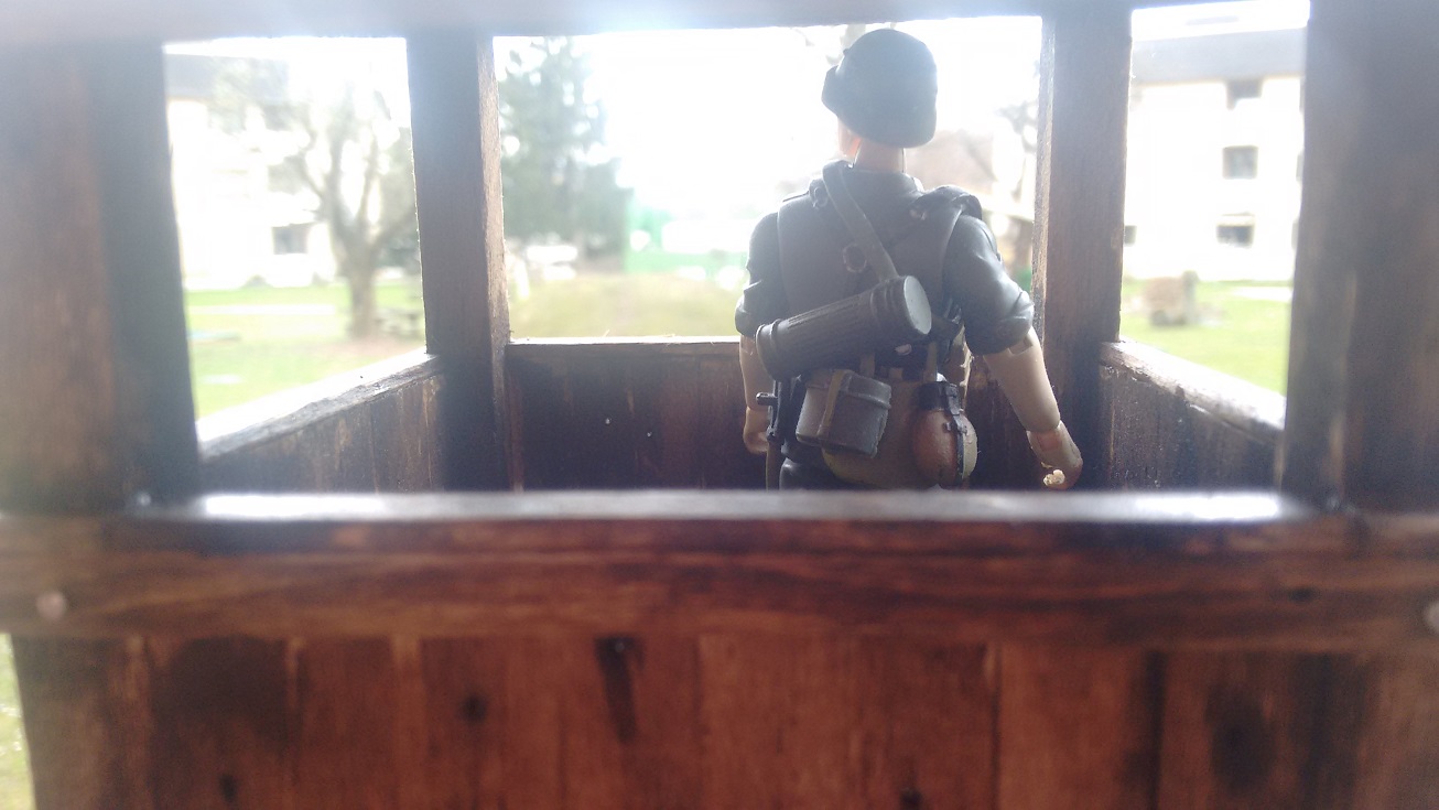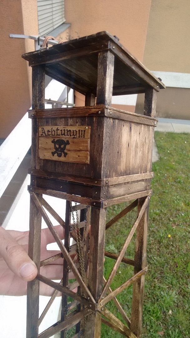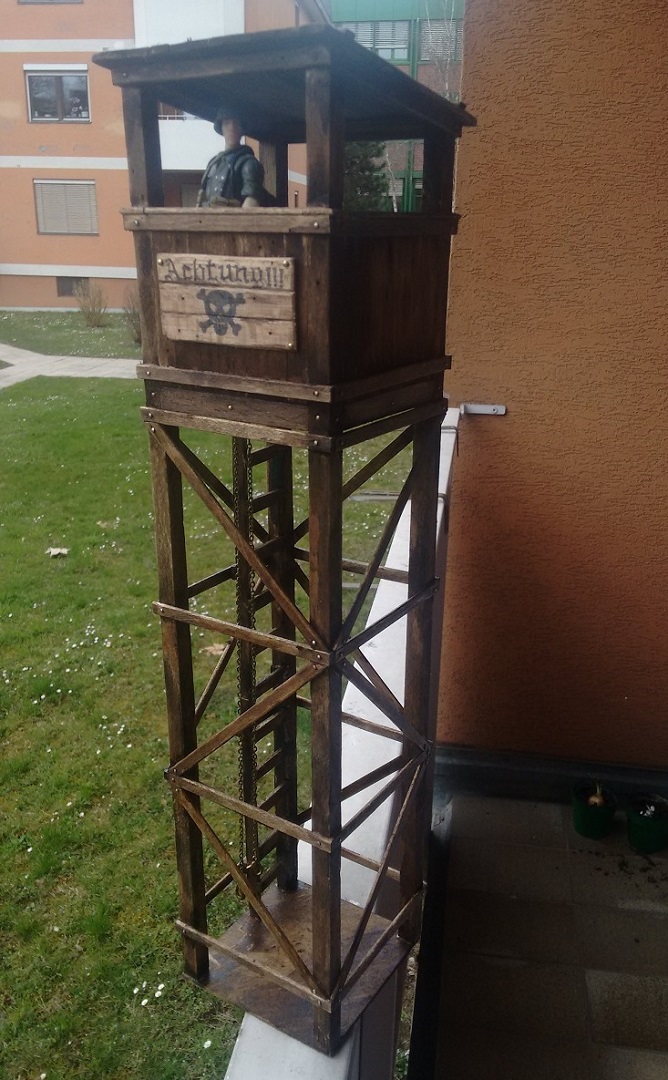 The tower is still far from being finished... Im going to add some camo nets in the "windows" and then the electronics. The working radio controled warm white search light with pan and tilt movement, a stove inside the tower, and maybe a hand made sniper detector... And thats a moving helmet. I think it will be a cool idea. Also some more scratch built details like a telephone, boxes and so on...