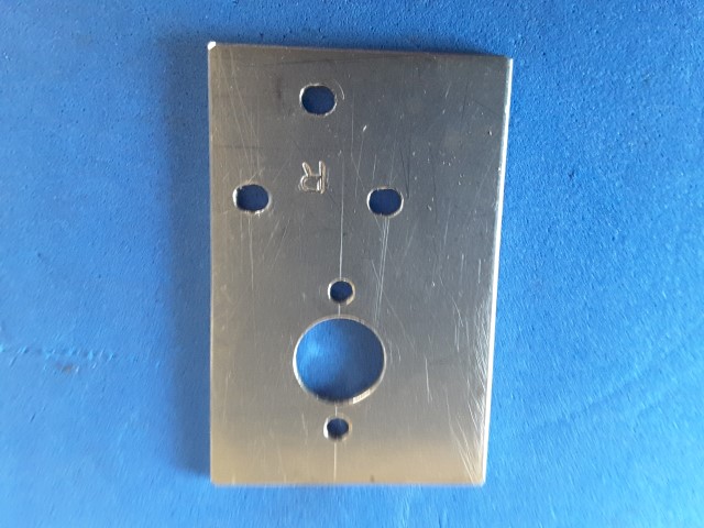 The motor holding plate. The 3 bottom holes are elongated to give some fine adjustment to the pinion and bevel gear.