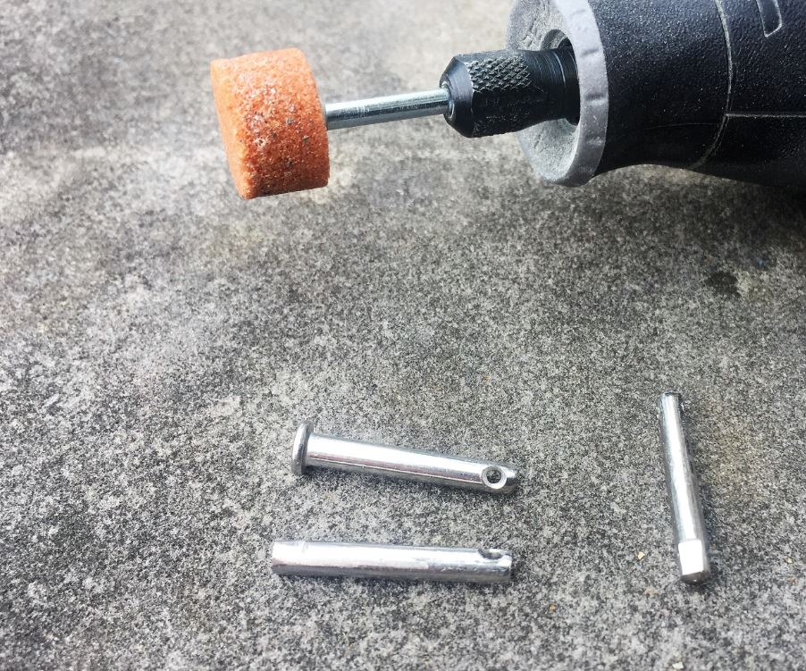 First task was to create two 4mm chafts to connect the Traxxas drive chafts to the sprockets. They were made from M4 25mm long "stainless Lock Cotter Clevis Pins with flat Head Hole Cotter-Pins" bought on ebay from China for a few pennies. Original on top left.