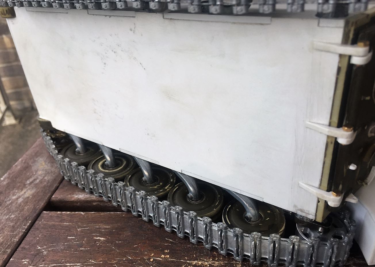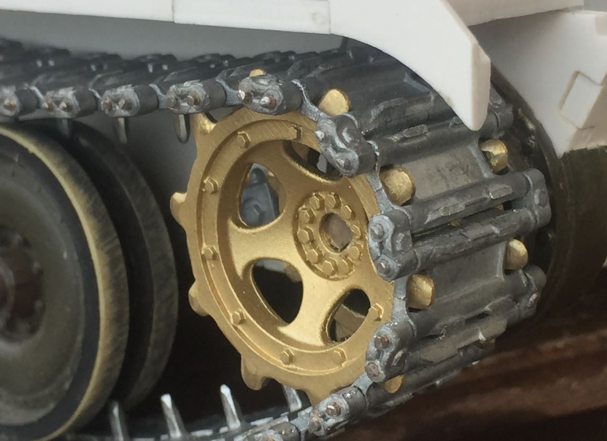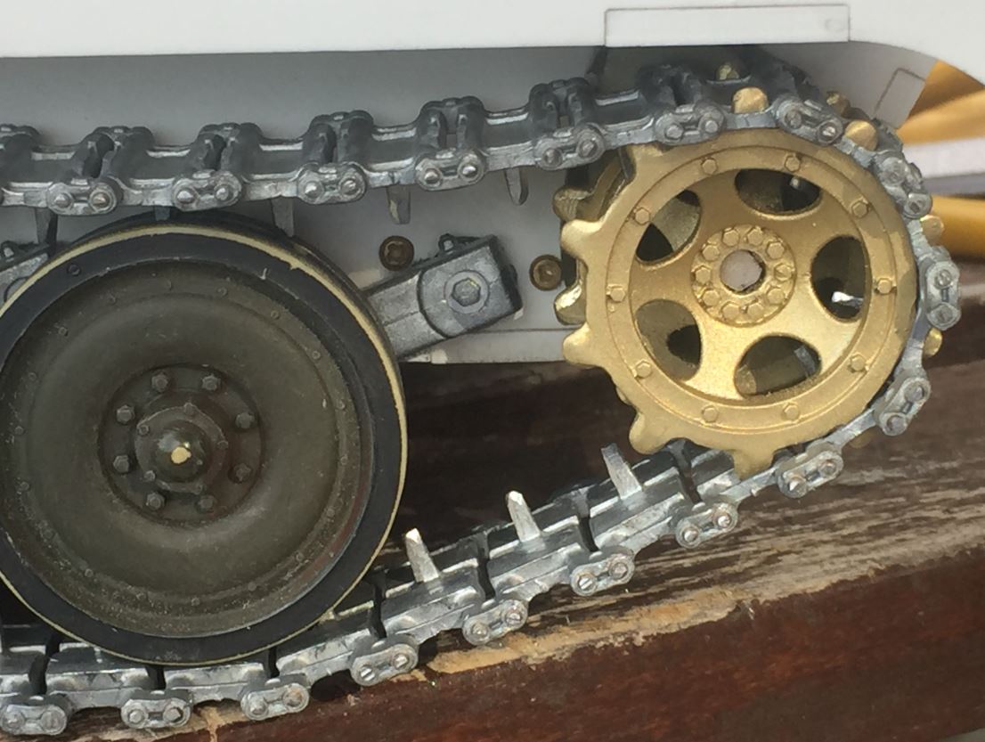 I removed 1mm from the length of the Panther suspension arms so that the road wheels are better aligned with the sprockets and idlers. The Verlinden road wheels are performing well.