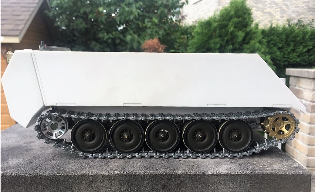 The mounting of the motors is quite unorthodox for an RC tank. Not sure you and I have ever seen something like this. Positioning trials were critical so that the drive shaft is placed with the least friction, then once the optimal position is found, the mounts are reinforced in place.