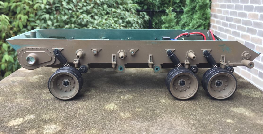 Because the bottom of the inside suspension arm need room to operate, a hole is required to be made at the bottom of the hull for these, it does not show from the outside. Then a 4mm hole is made to go all the way in and even a few mm inside the battery box to provide extra support for the 4mm brass shaft.