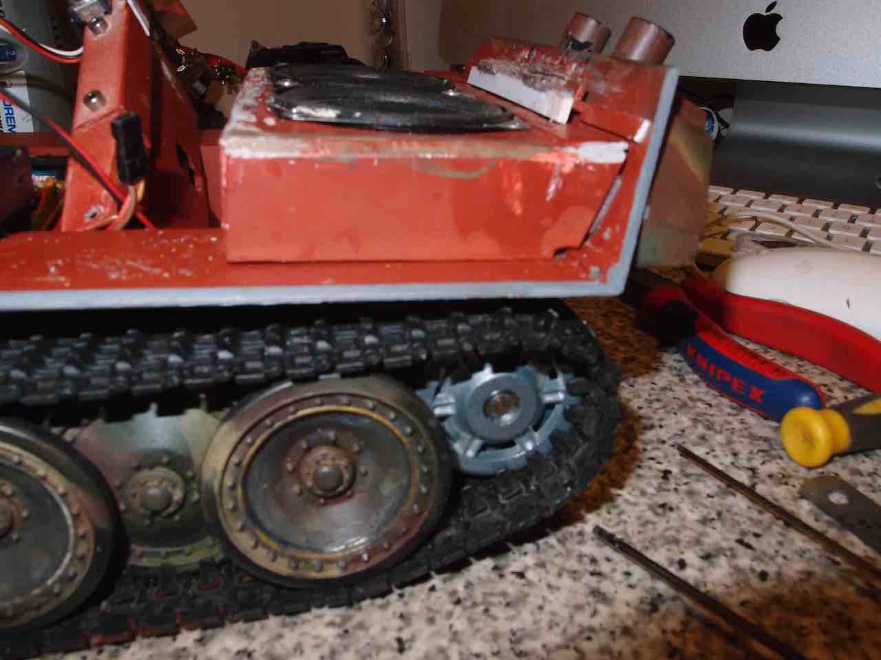 New metal sprockets and idlers to replace wobbly plastic HL ones. Sprockets not very good had to file down , inner side quite thick.Might need another go on the teeth look like a wider profile . Changed gearbox's to Taigen ones, fitted a new base for the gears . Going to use the Waltersons ones for the metal lower hull . Had to drill new fixing holes in Taigen gearbox as the original holes are under gearwheels and spindles.