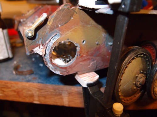 Going to keep the Hl lower hull , Taigen hull will be saved for the Trumpeter project . Fitting supports for the sprockets and taking the edge off the lip on outer road wheels .