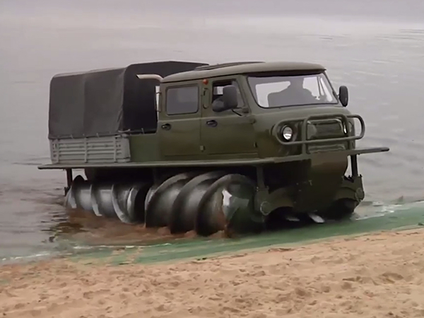 Well, this is a bit of a cheat. Here's vehicle that might well have had tracks, if they hadn't fitted it with screws first. :D ;) It's certainly very unusual, like some improbable machine in a cheap sci-fi flic, or a 1950s Jules Verne epic:
