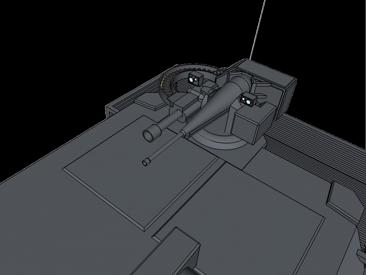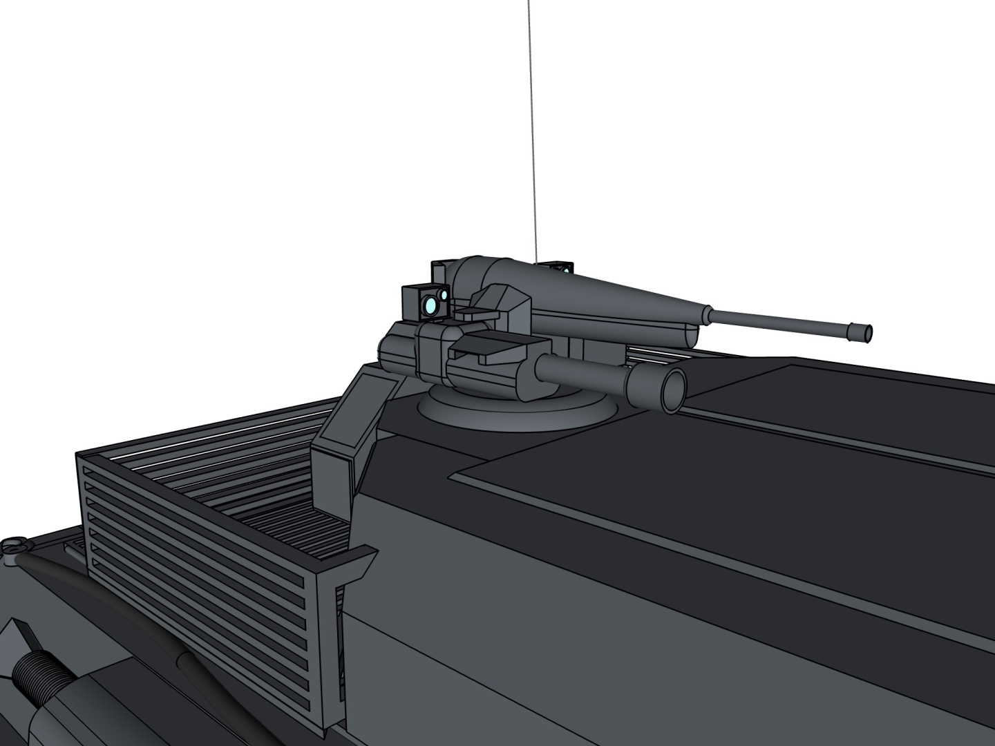 Designed the Mk 1 of the remote turret. The turret was supposed to be more heavily armed for anti-infantry purposes than most any remote turrets used on modern MBT’s. It features a 20mm autocannon that uses high explosive shells, duals as an anti infantry device as well as short range anti aircraft. Attached to the side of this is a grenade launcher modified to be remotely used. Sits on a separate rotation scheme than the turret, so that it can move semi-freely and independent of the gun turret. The grenade munition box was initially put at the base of the turret to prevent the autocannon from being knocked out should it be struck and cause the grenades to detonate. Issues arose from this. Will explain later. Grenade turret Mk2. The placement of the grenade box in the mark one created many issues. 1; limited traverse, the turret could not freely rotate 360 degrees without wrapping and tangling the feed of grenades. 2; should be box be hit multiple things could go wrong.