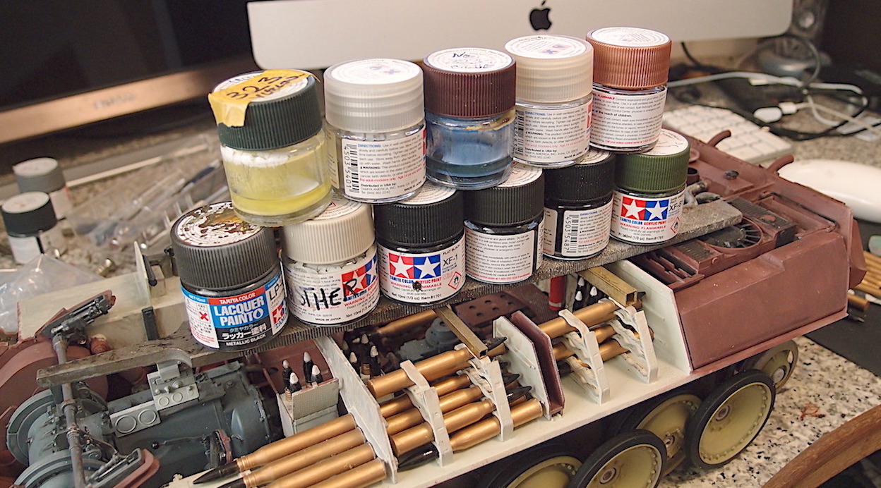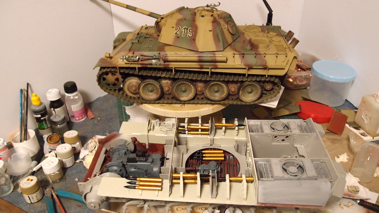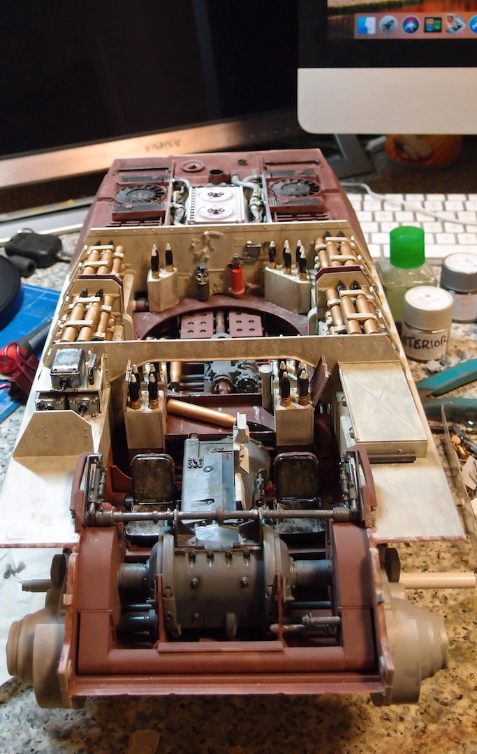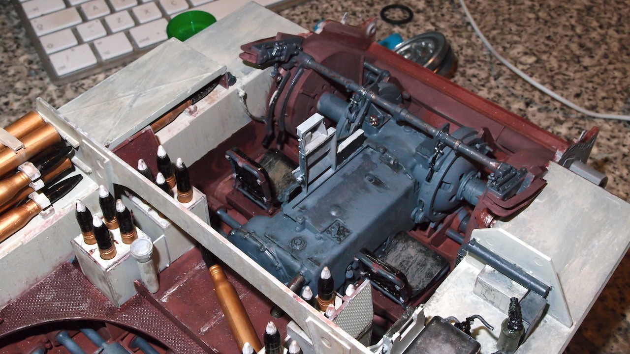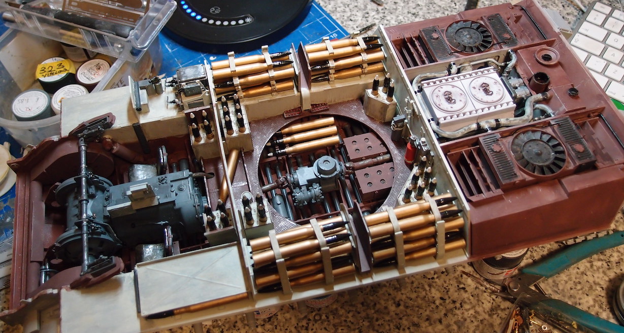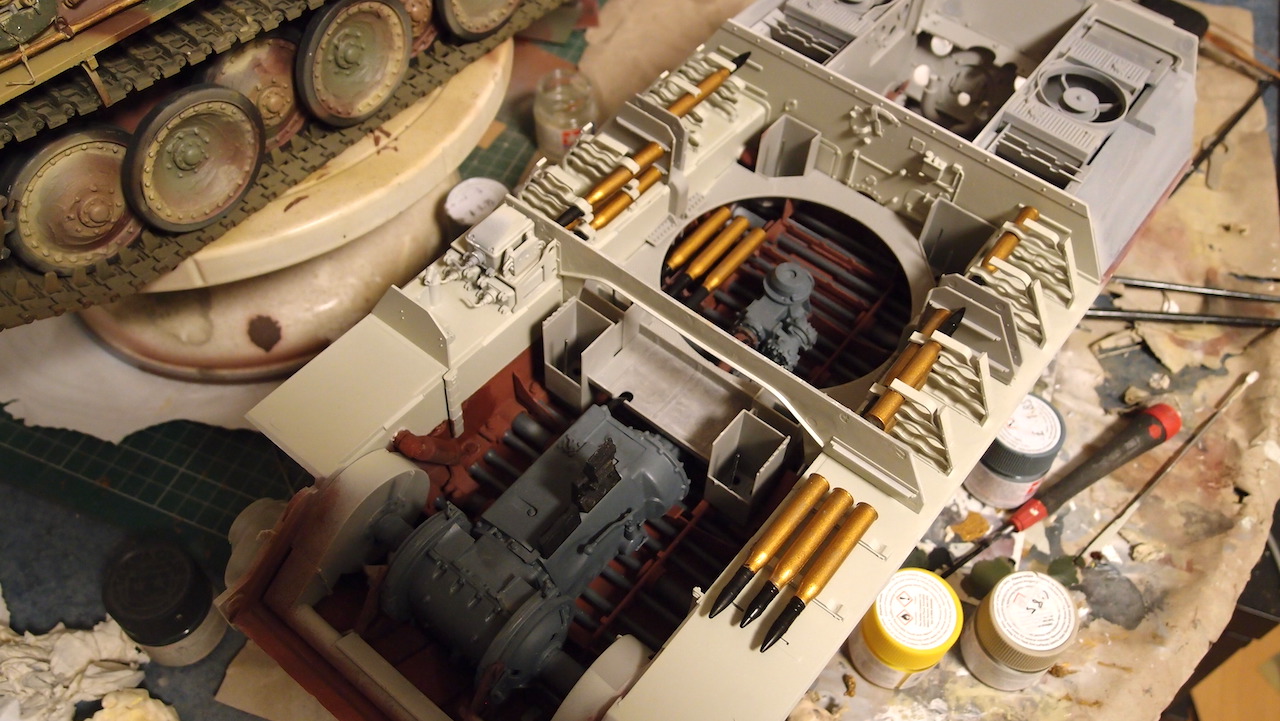 Back onto this ,managed to mix tamiya colours for interior. Not perfect but it will do. Made up some sub assembly units and painted , tried for fit. Painted some shells and sat them in , brass needs toned down. Almost worked out a way to enable engine removal, Should have not glued the support panel for the filler tanks behind engine.