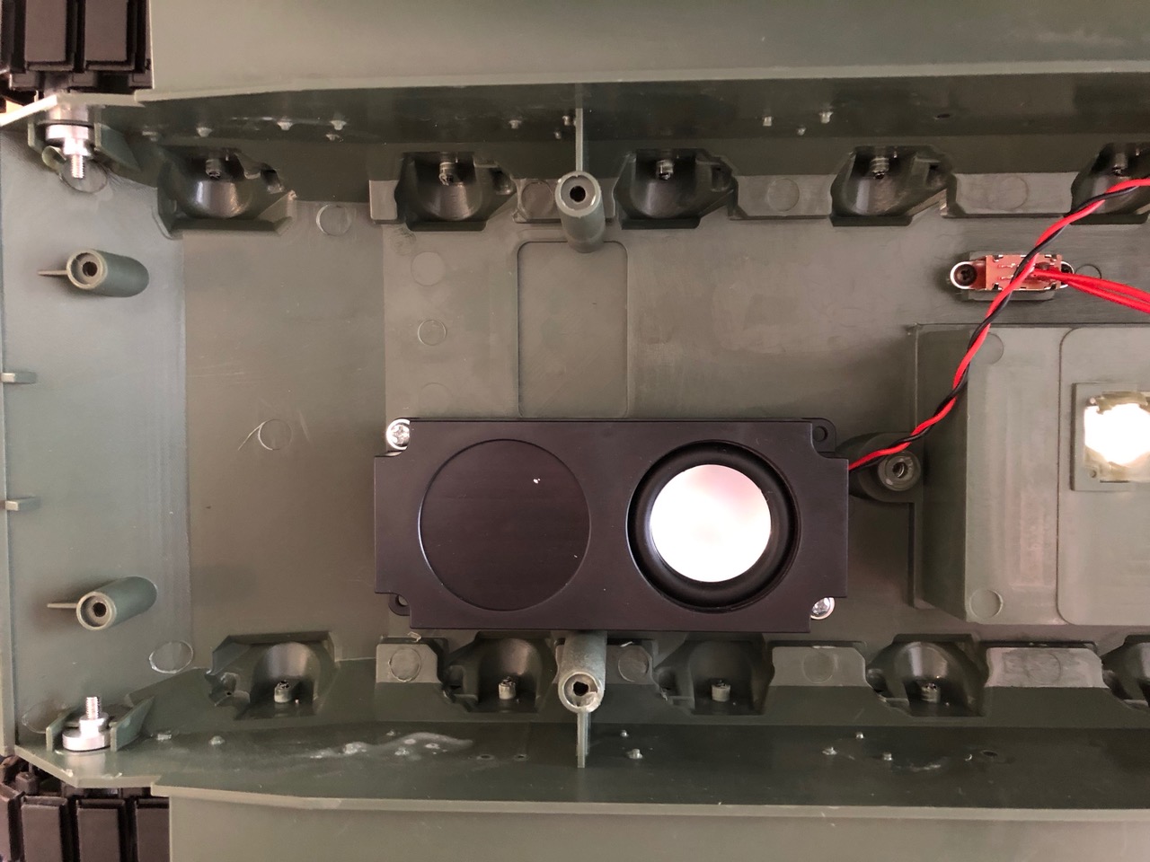 Inside, there's acres of space. The revised speaker looks ok, and in the corners, (left of pic) you can see the tiny meatl track adjusters/tensioners)