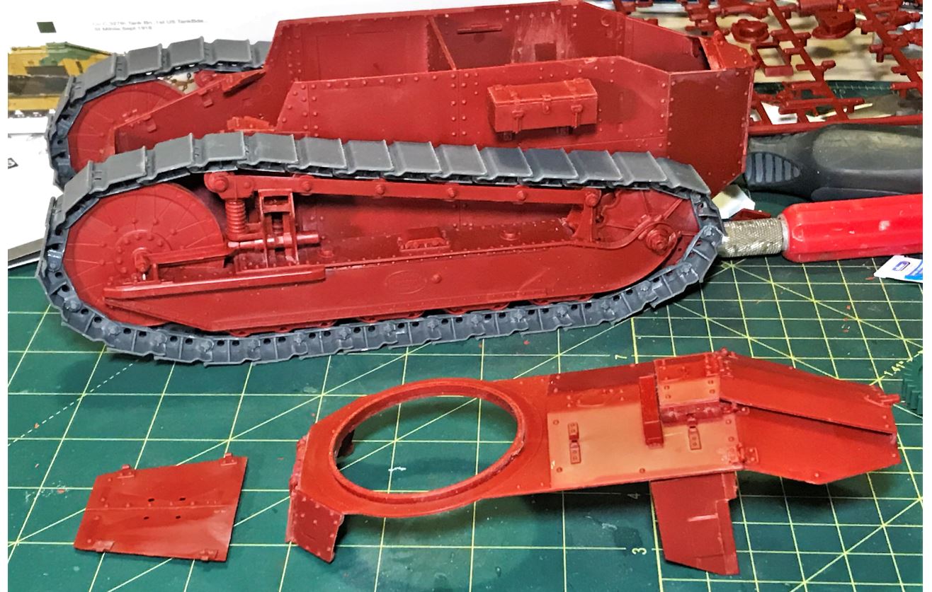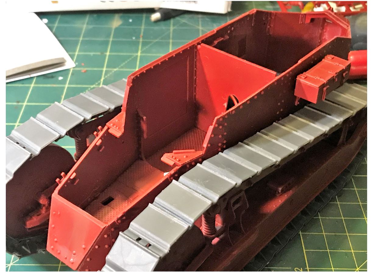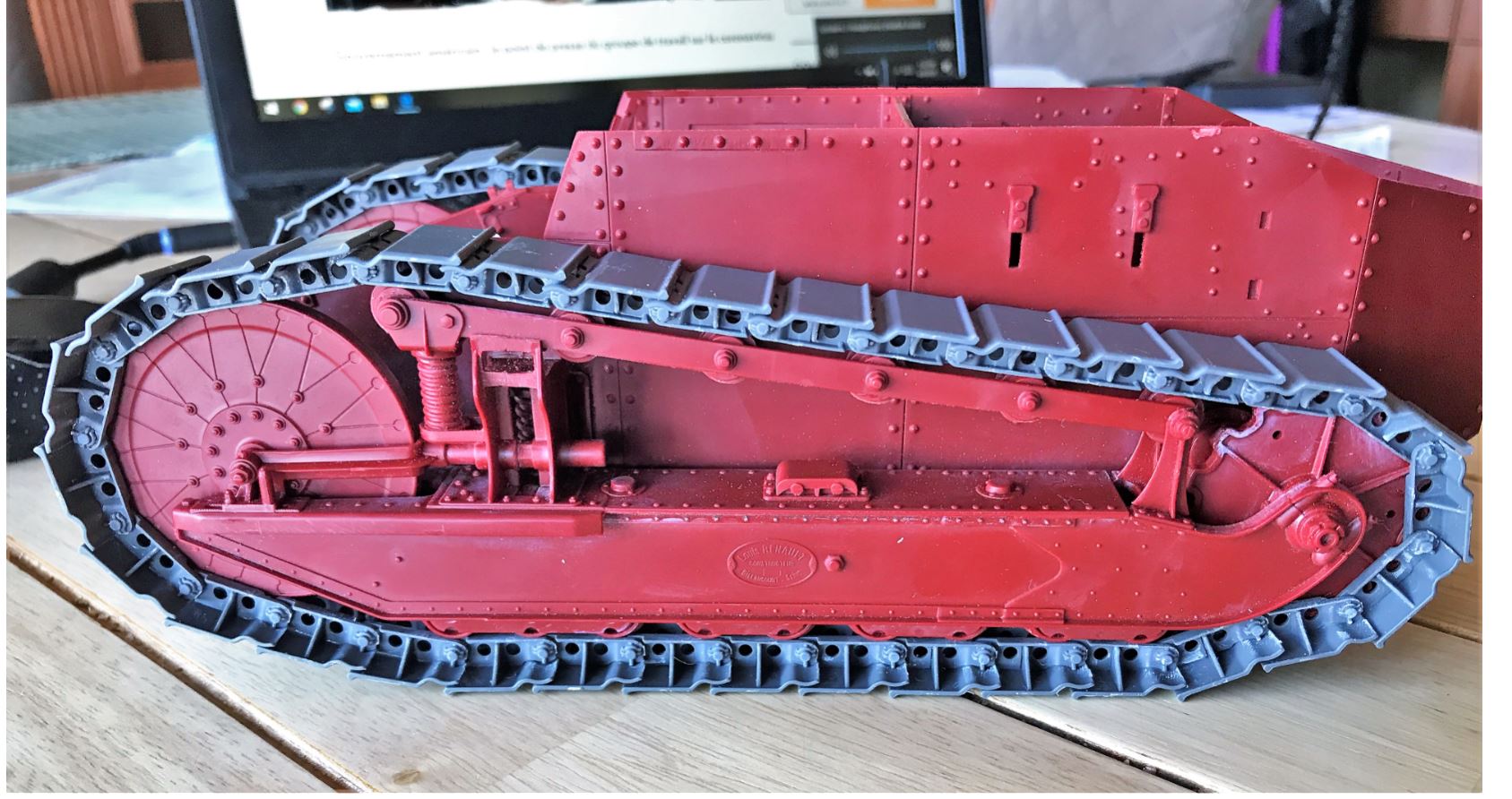 The tracks are installed on the Renault FT chassis. Although there is no tensioner, they are perfectly tight and running well.