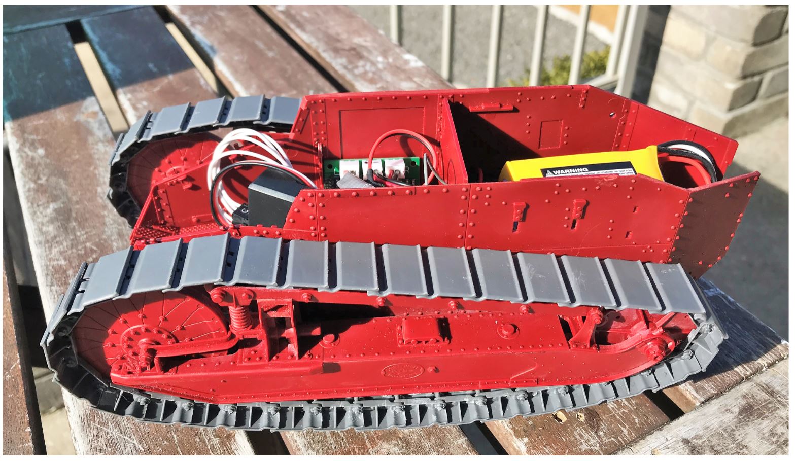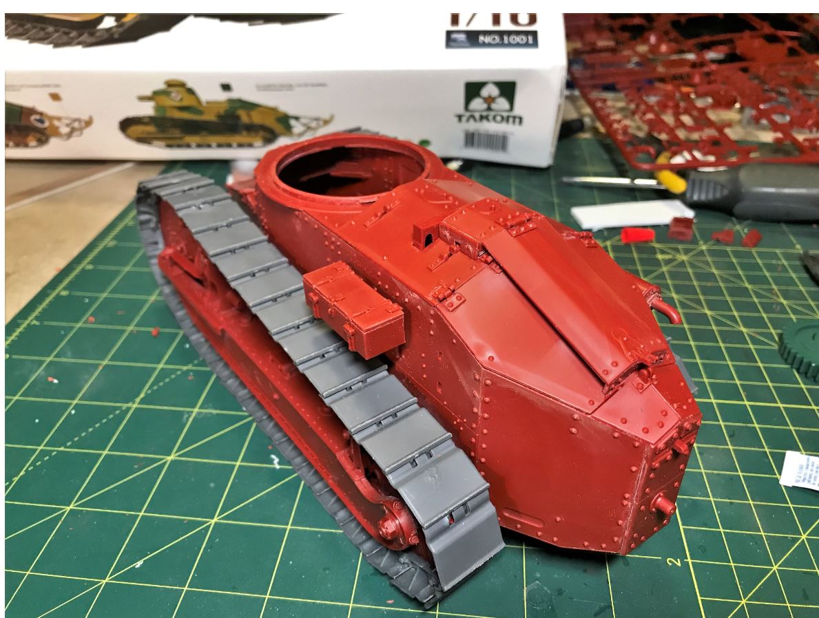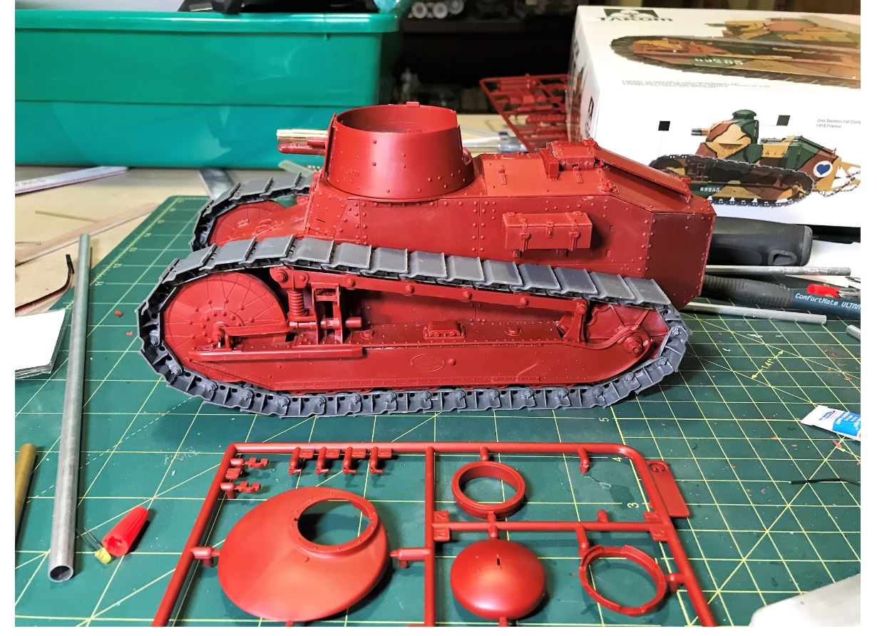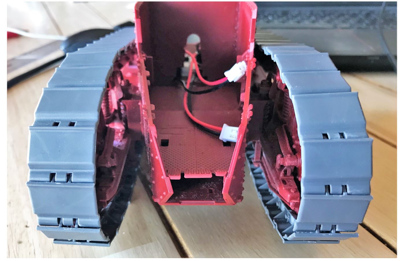 The tracks are installed on the Renault FT chassis. Although there is no tensioner, they are perfectly tight and running well.