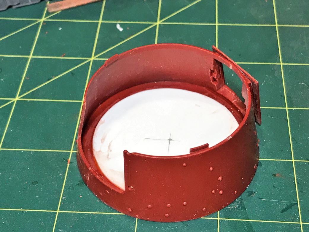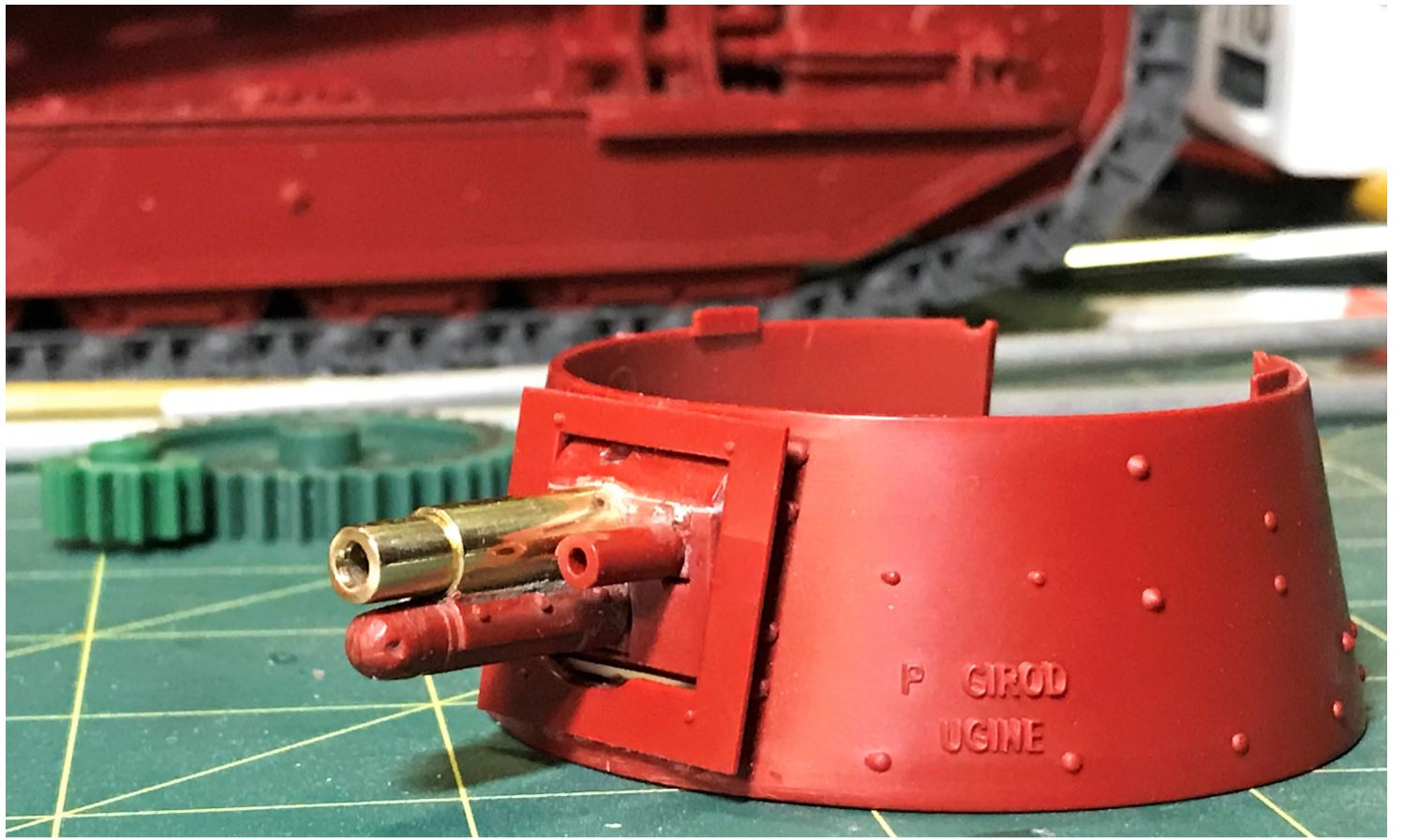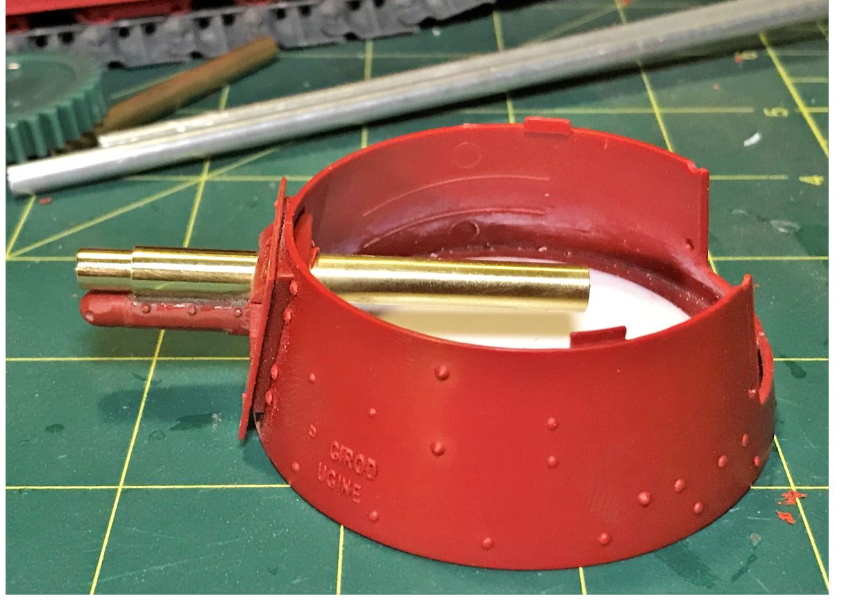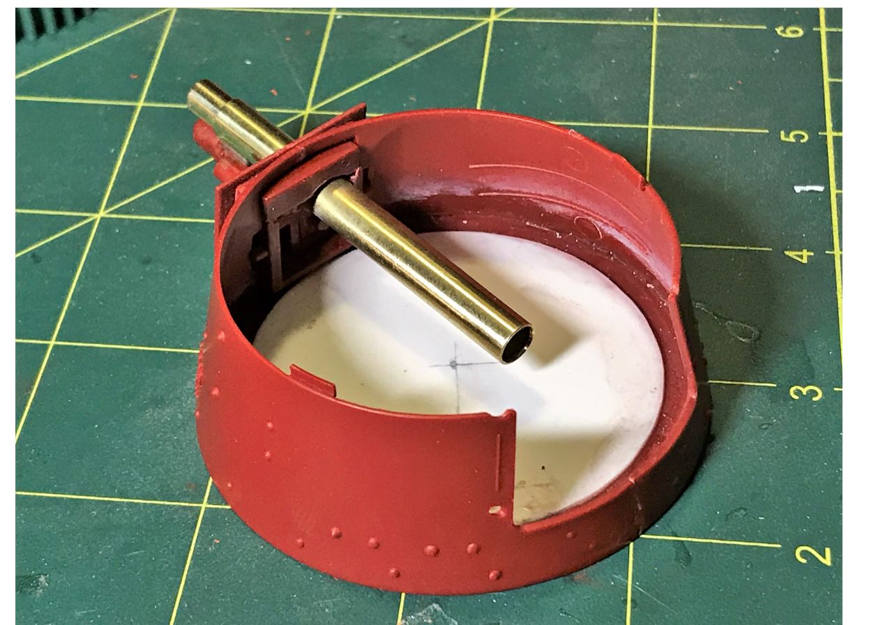 The 2 overlapping brass tubes are extending inside the turret in preparation for the creation of a custom recoil mechanism. At this time, it is unknown if I will be able to install gun elevation within such small turret. The priority is turret rotation, then gun recoil/flash, then gun elevation.