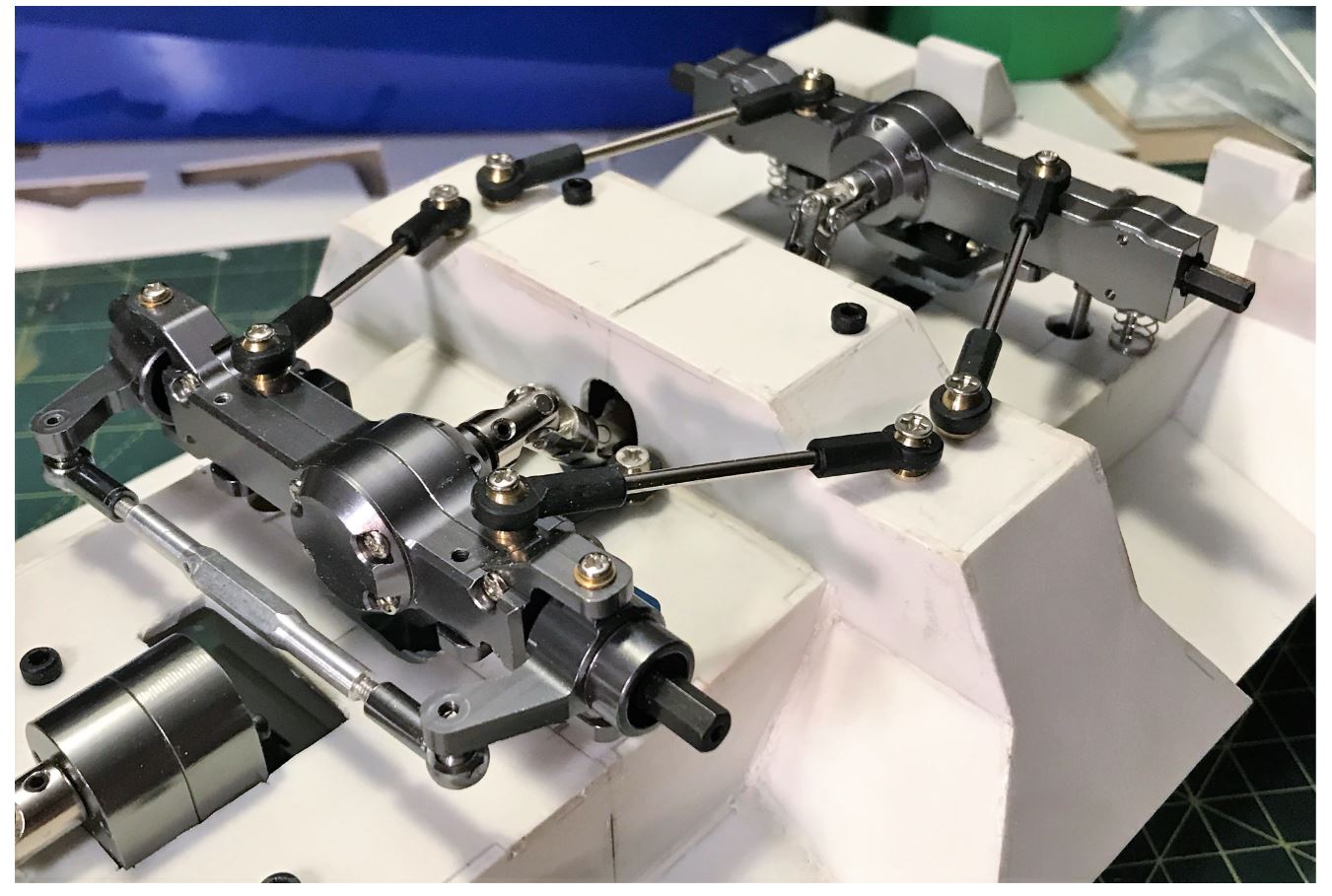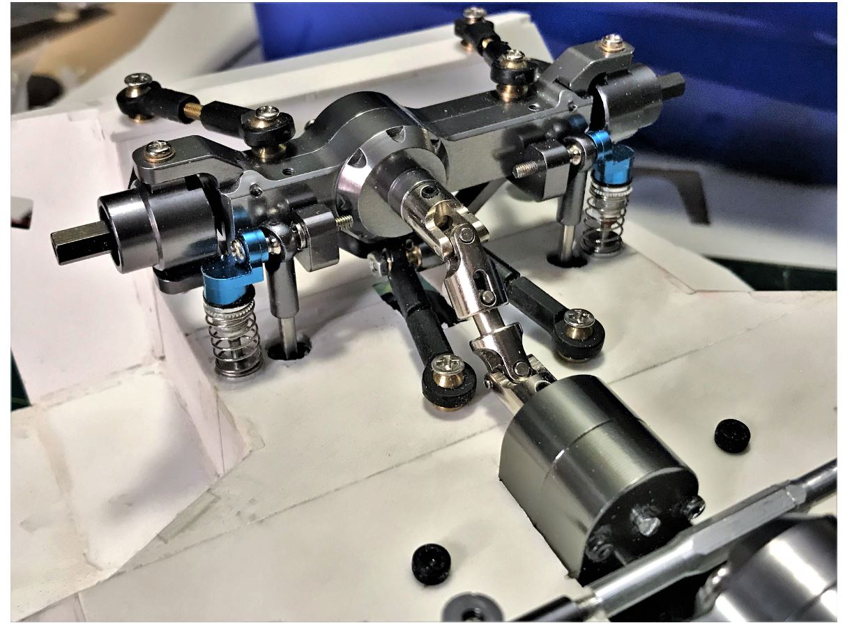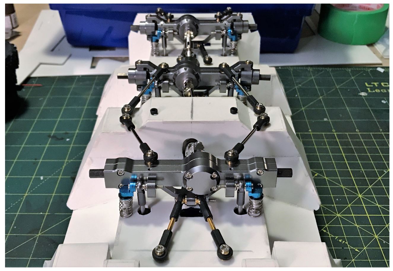 Overall, this was a great new modelling experience for me, to design and mount a 3 axle drive train on a large scratch built vehicle, never done that before. I hope they will run well. Next step is to install the steering servos, wire the motors and do a powertrain test.