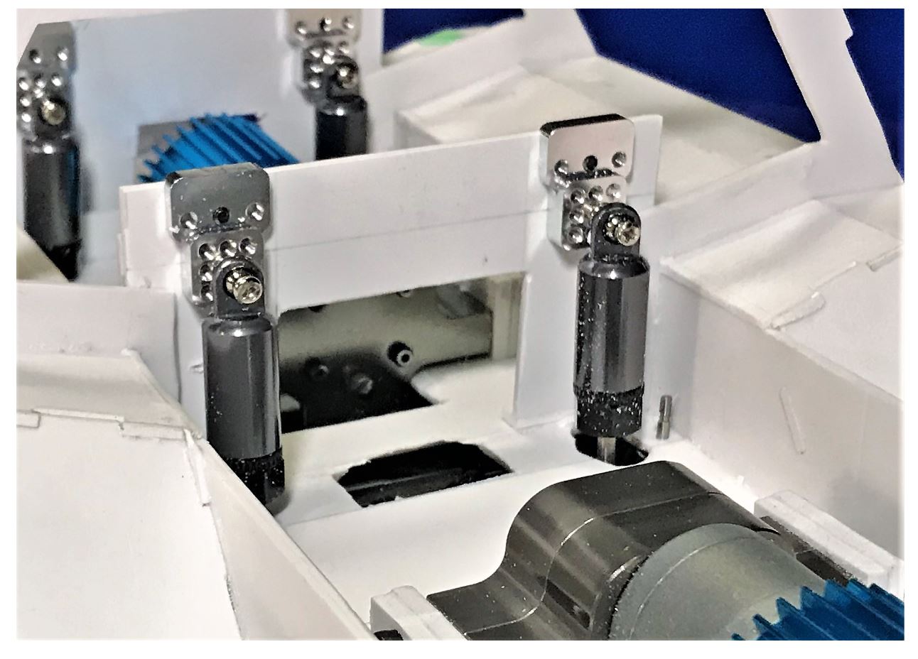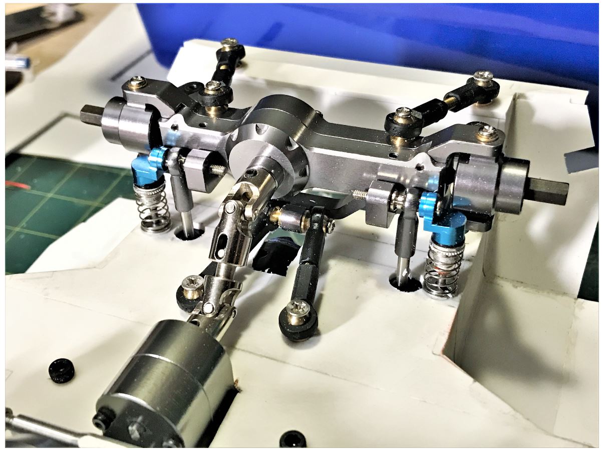 The dampers were provided with adjusting mounts. Little gizmos available on eBay for a few dollars and are fun to use. They were quite valuable during the positioning and alignment of the suspension, the three main axles needed to be aligned. Be aware that the bottom of the Fuchs hull is not flat...