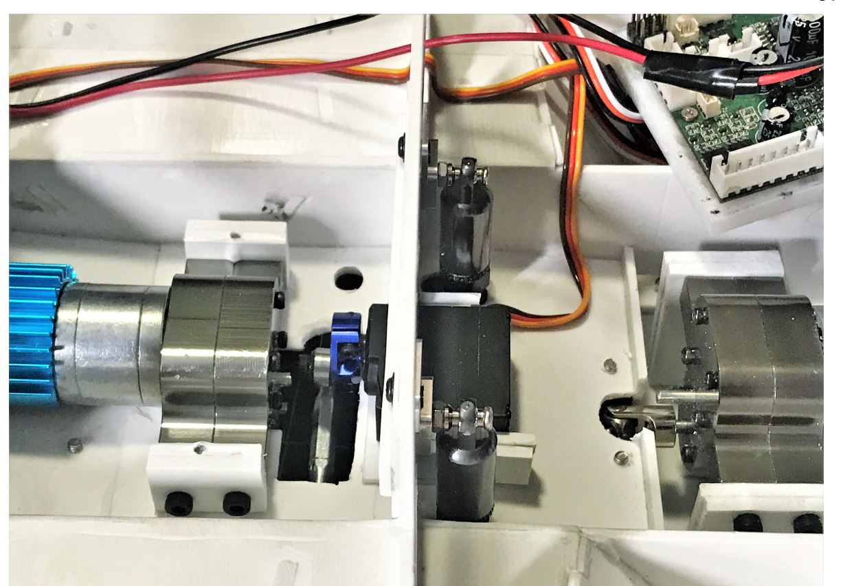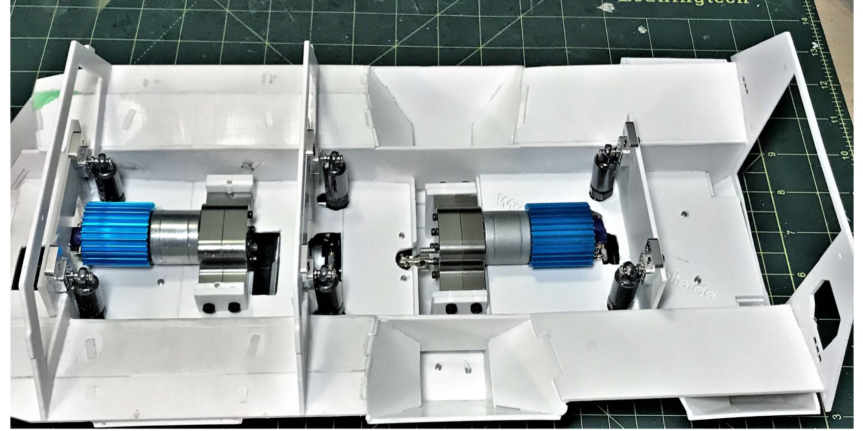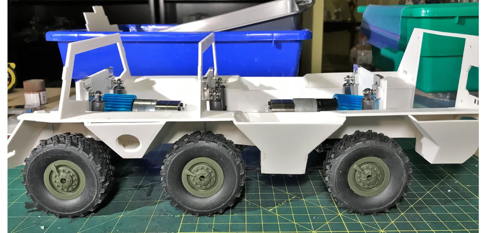 This is the interior arrangement with the front motor providing power for the front axle, and the rear motor providing power for the middle and rear axles. This will be a true 6x6 and should be quite powerful. The Clark TK40 control board allows for two motors to work in tandem, pretty much the same way it does for the left and right gearbox on a tank.