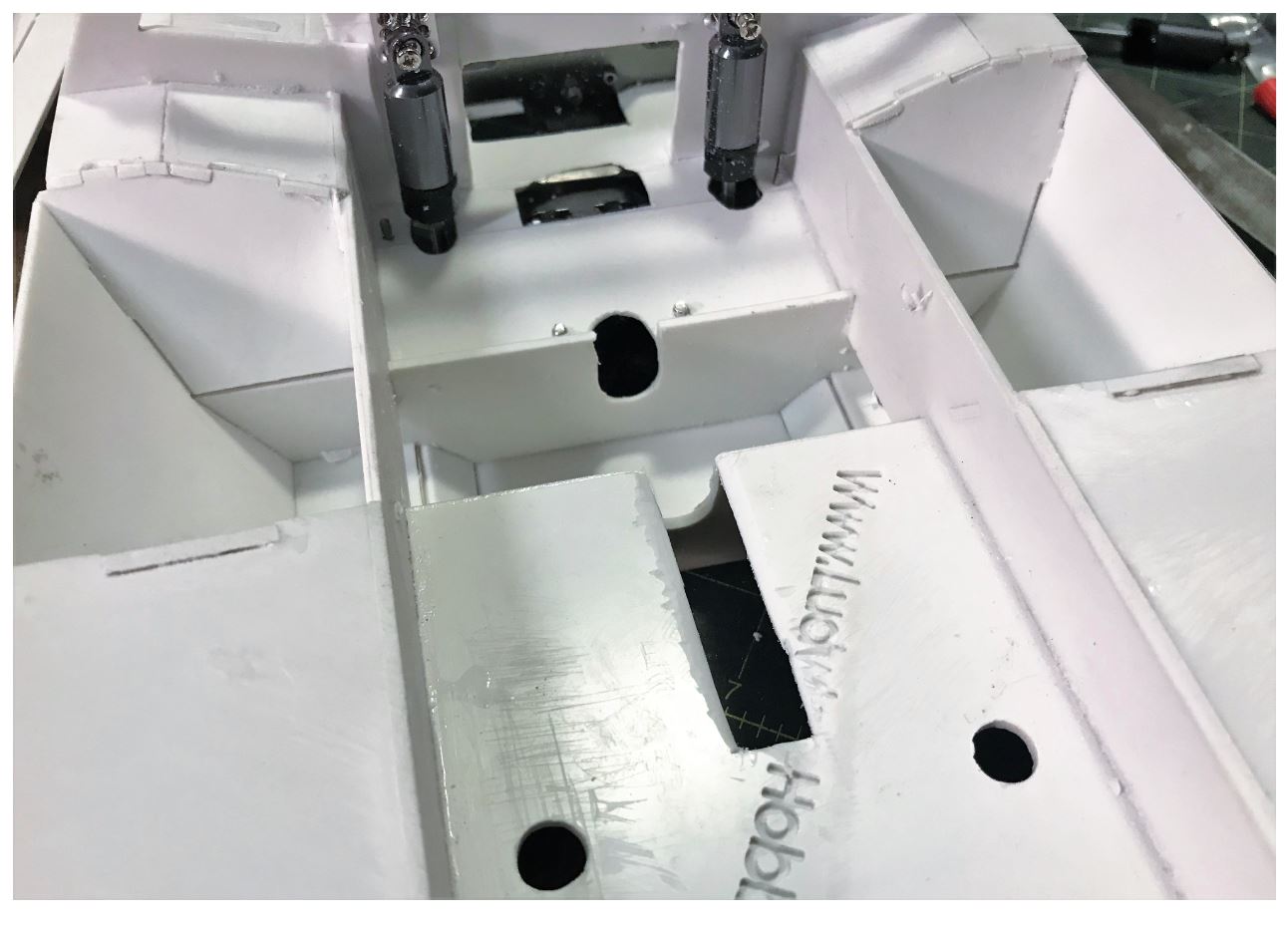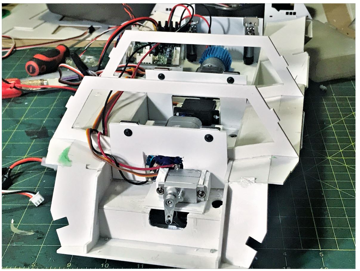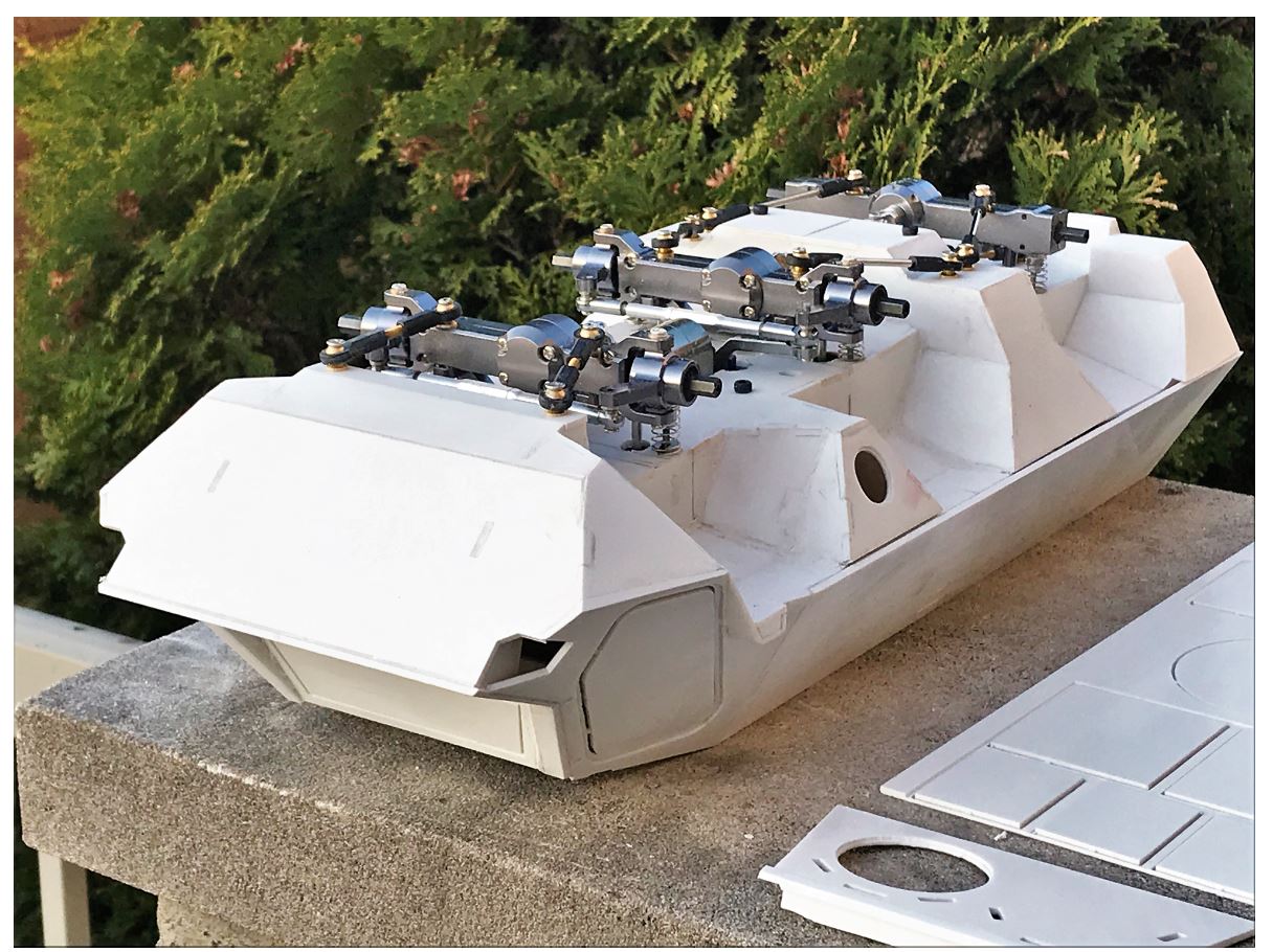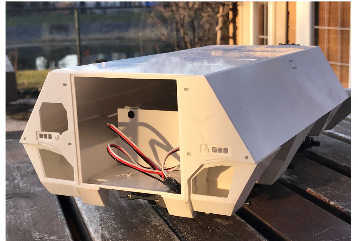 After having been cut away to make room to maneuver during the installation of the mechanical parts, the cabin section is now re-attached to the hull. The weak link connecting it to the hull is re-enforced with plasticard parts.