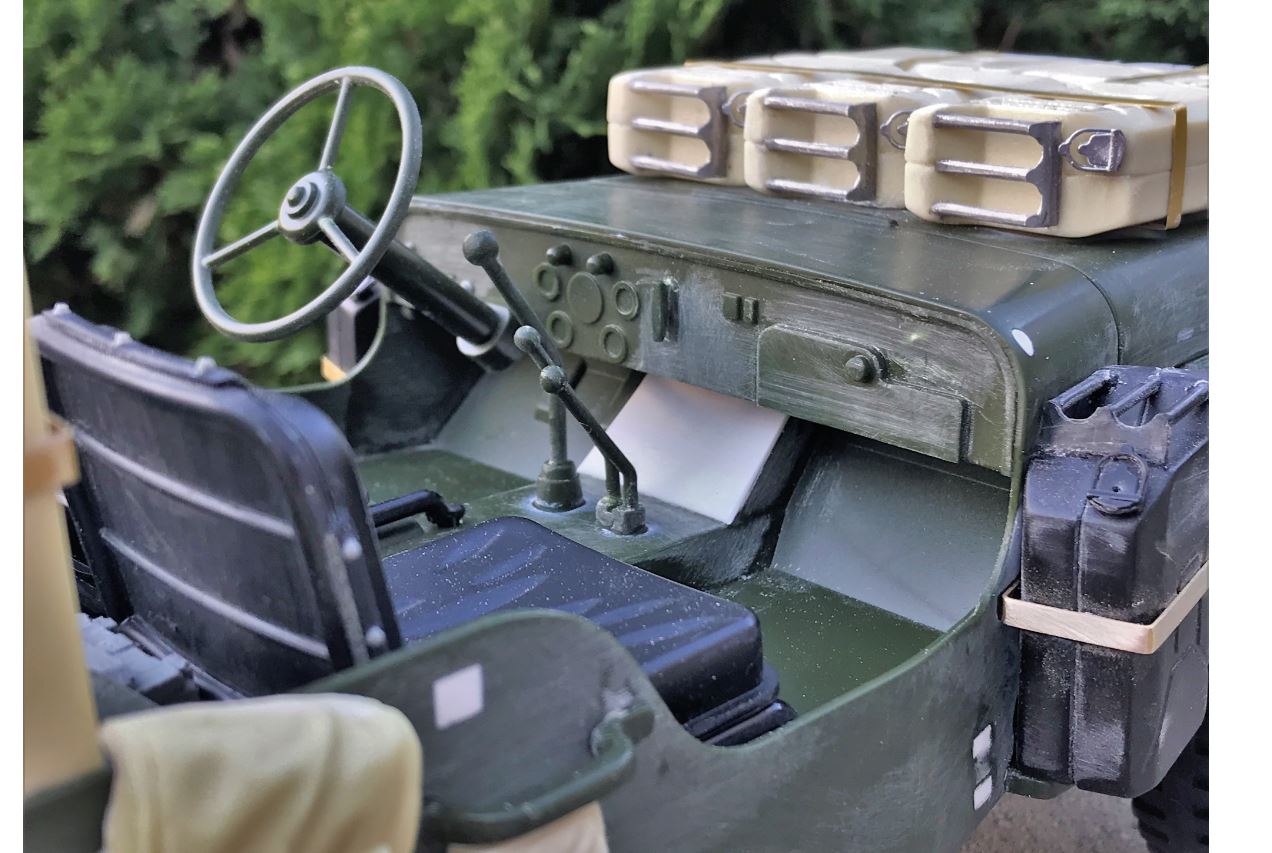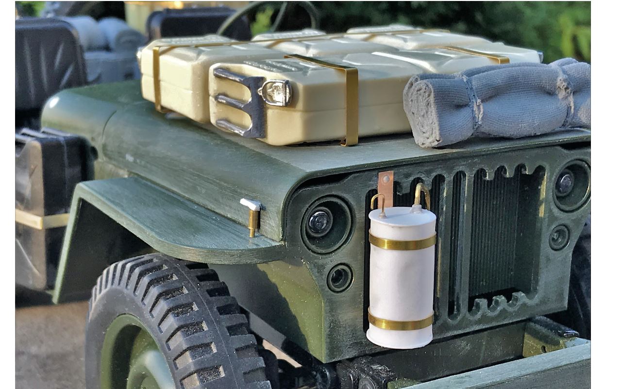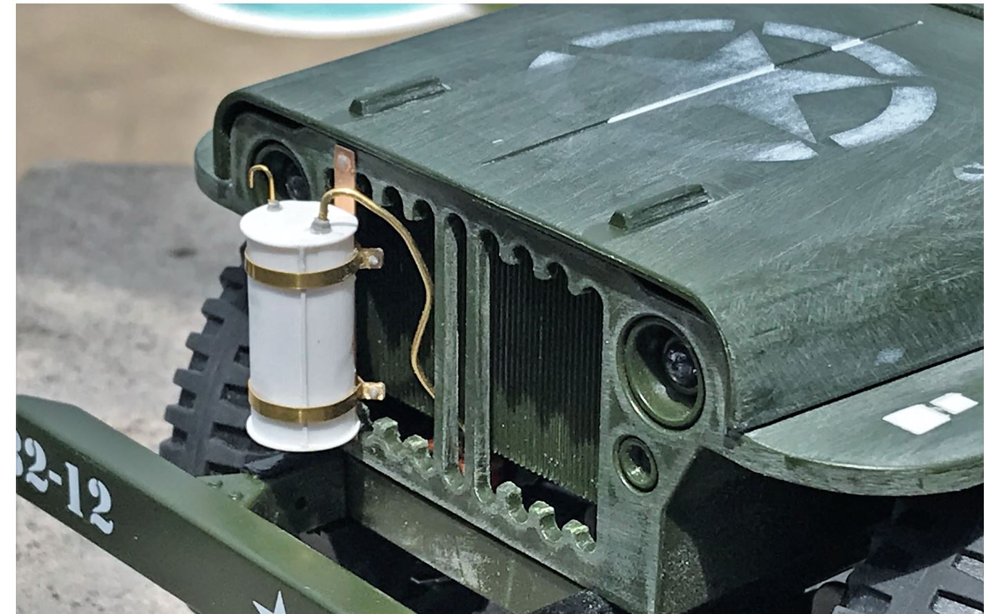 And mounted on the left side of the radiator. Notice that the Jeep front grill bars can be easily cut for a realistic representation. I am grateful that the model included a realistic radiator part in the background.