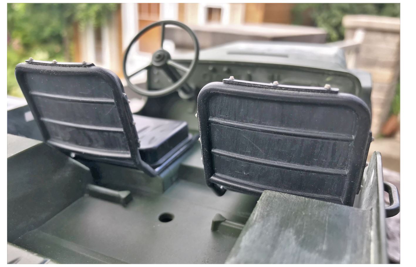 The seats are pretty good. Just need some cleanup of the seams on the mounts and the ejection pins at the back, and the addition of the attachment points for the seat fabric. Noticed the pre-drilled hole on the floor for the machine gun mount. I assume the designer originally wanted the Jeep to be armed but they ended up plugging the hole with a plastic part.