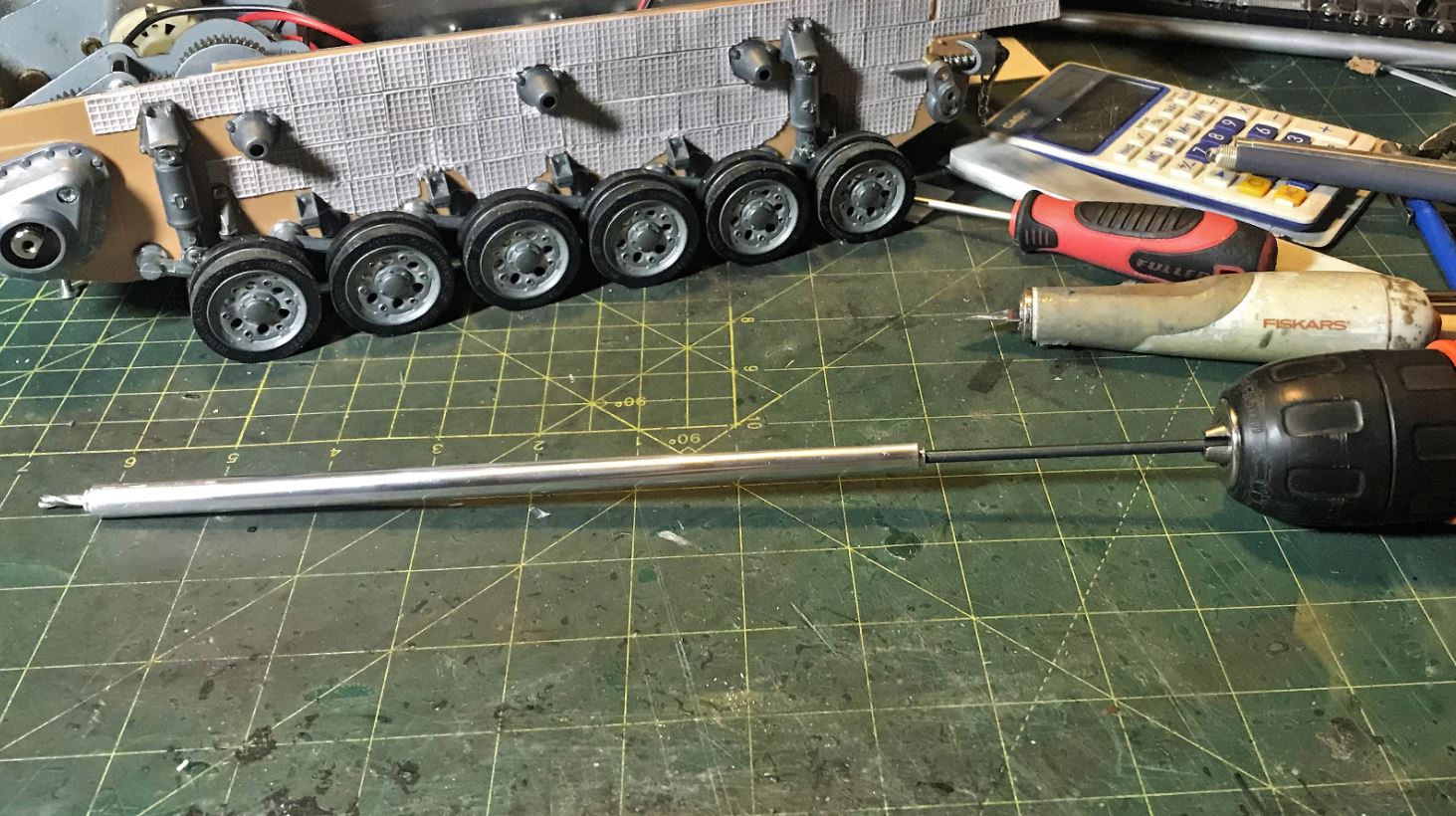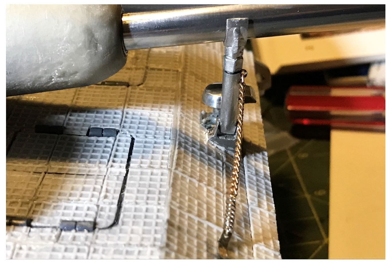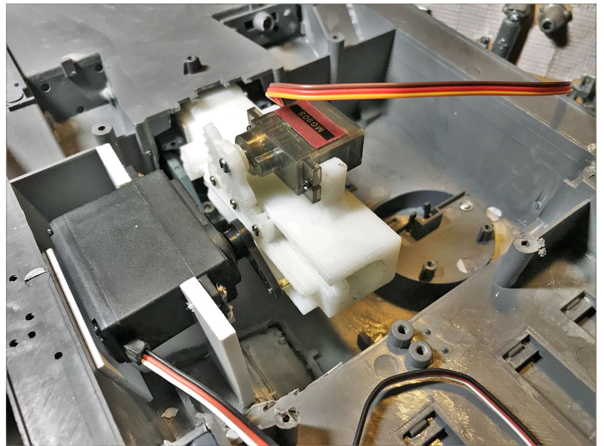 Gun elevation is provided by a large servo running a bolt head with a brass ring through the Clark elevation channel. I did not provide horizontal adjustment, not really worth the trouble.