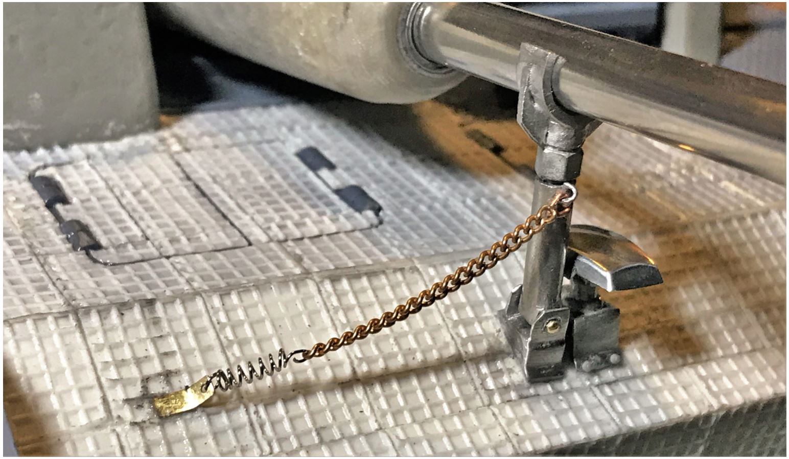This is the Modellino PanzerParts.com Stug gun travel clamp kit. Parts are cleaned up and ready for assembly. Very nice, only the tiny bracket that connects the spring to the hull need replacement by a thinner brass strip that allows a hole to be drilled into for the spring end connector.
