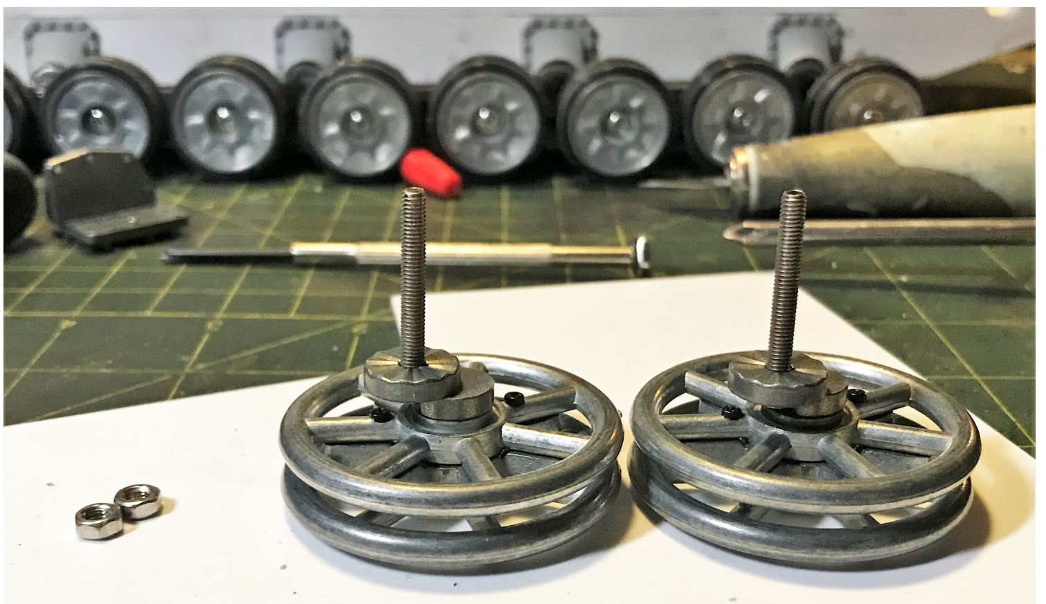 Mato Metal Panzer IV idler wheels with ball bearing are used. For the adjuster, i cannibalized a Mato Sherman idler adjuster to reuse the central axel.