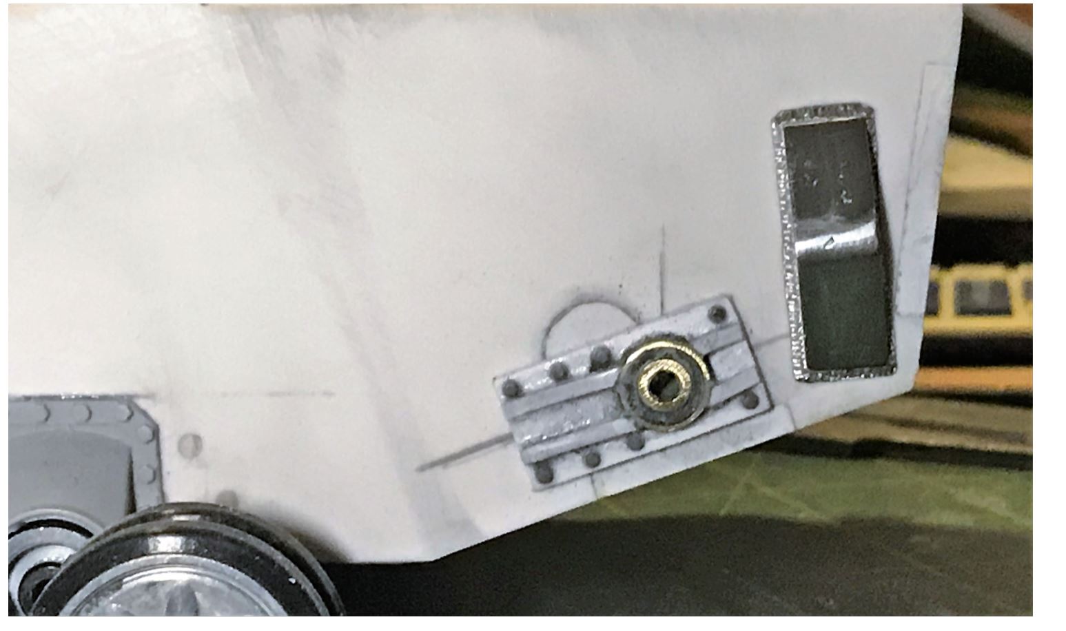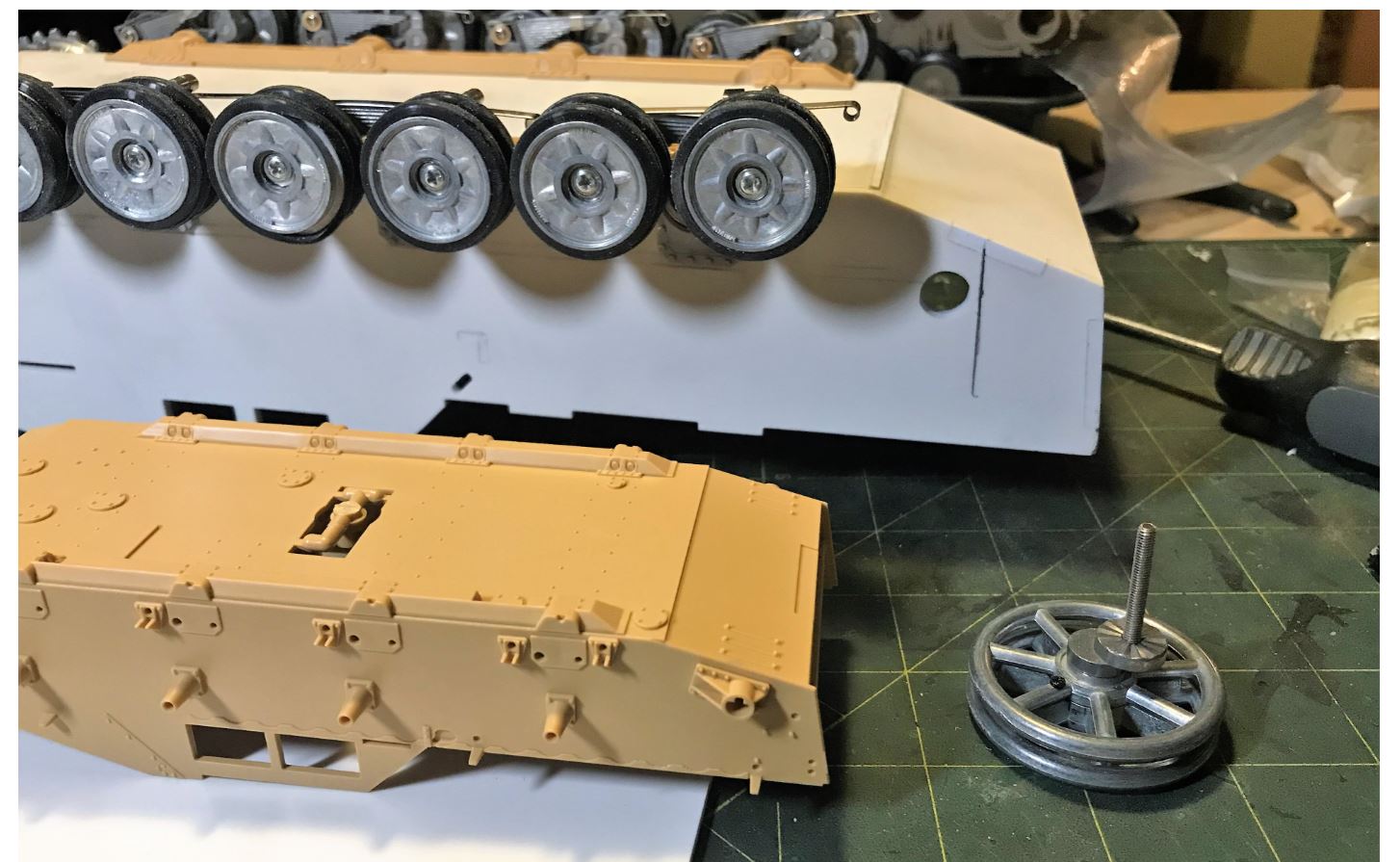 The pre-drilled holes are fully plugged inside and out, and measurements are extrapolated from the 1/35 kit for the placement of the new Idler wheel axel.