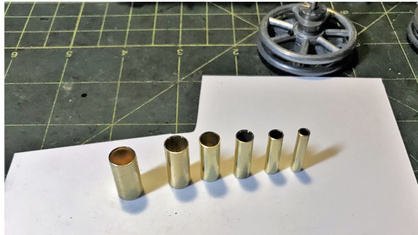 First task was to create a core body for the idler adjuster axel. As seen on many items on my past builds, It is made of overlapping brass tubes, from the size required for the Mato axel, and going up to the required size for the look and feel. What is important is to have brass tubes of the same brand designed to easily overlap, otherwise it could end up to be a frustrating struggle.