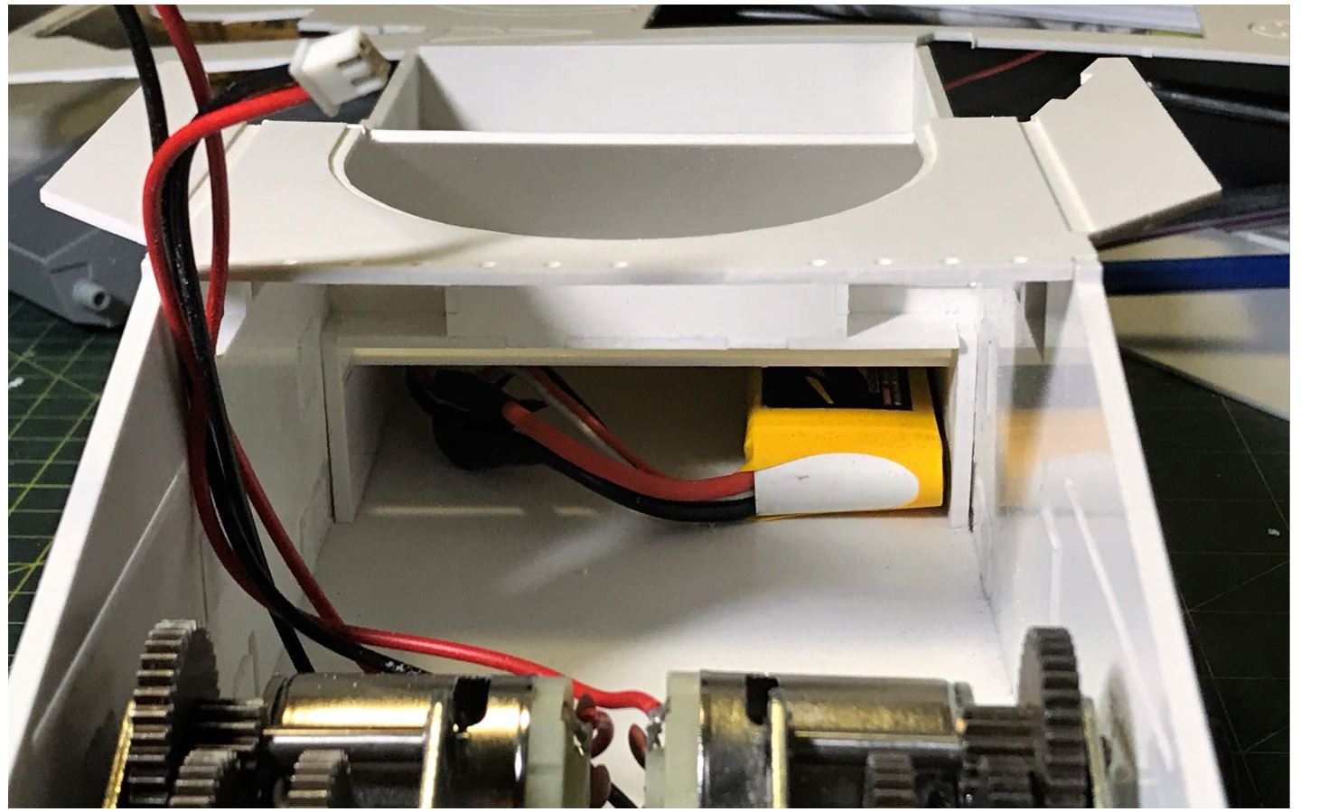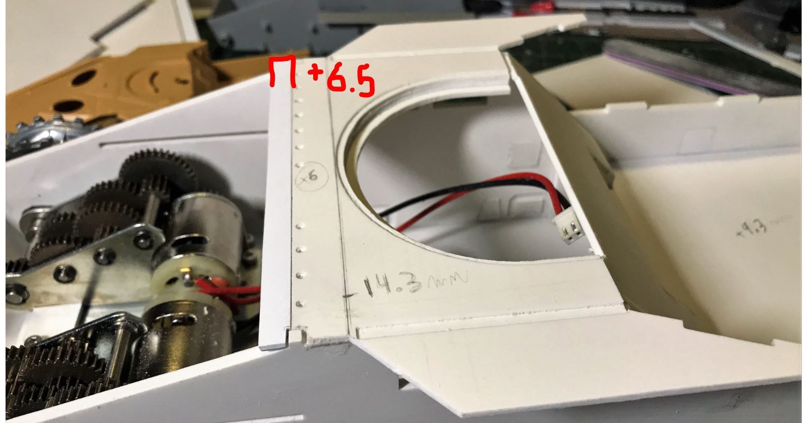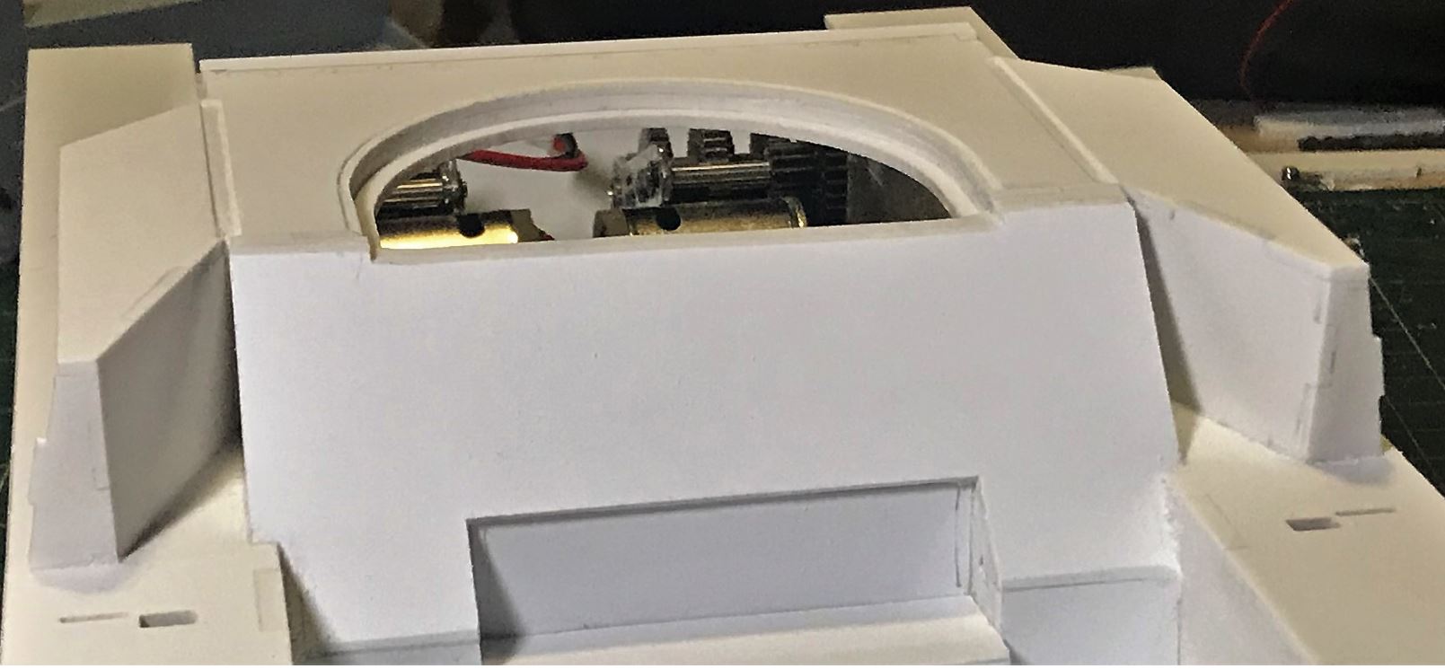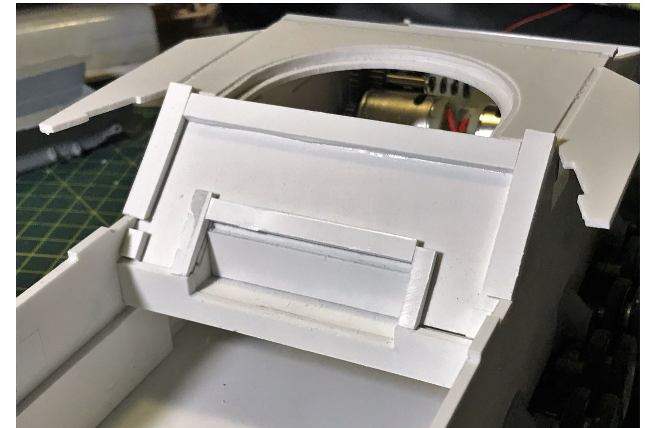 All the electronics will need to reside under the gun mount. There is only enough space at the back to place the battery, The main gun platform part is installed. It was later given a reinforcement beams under it at the front.