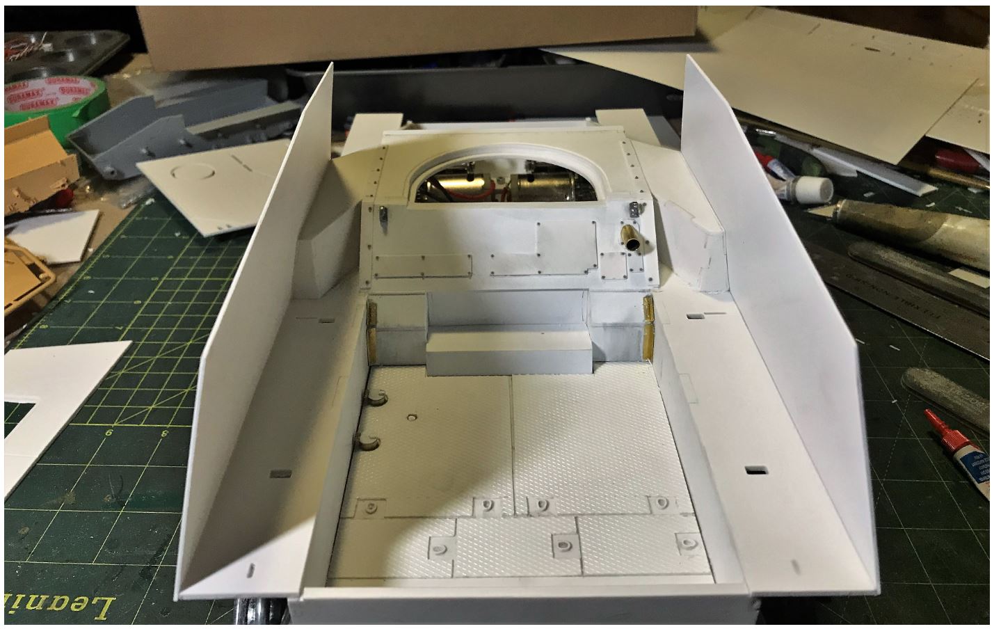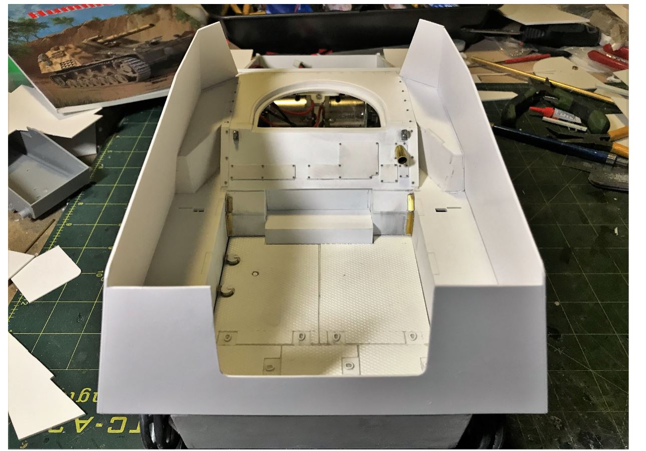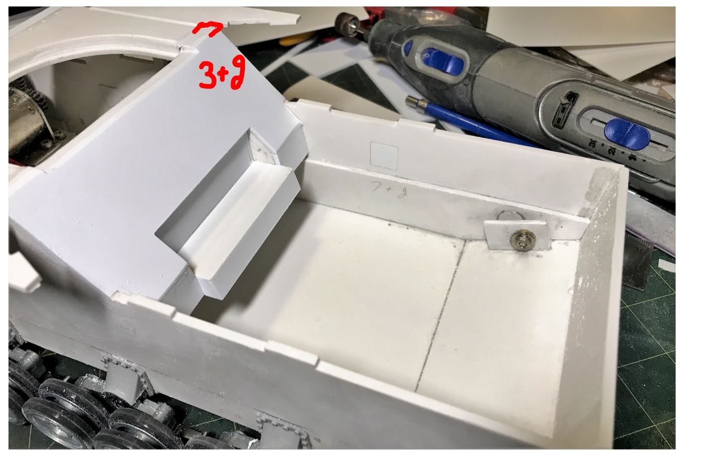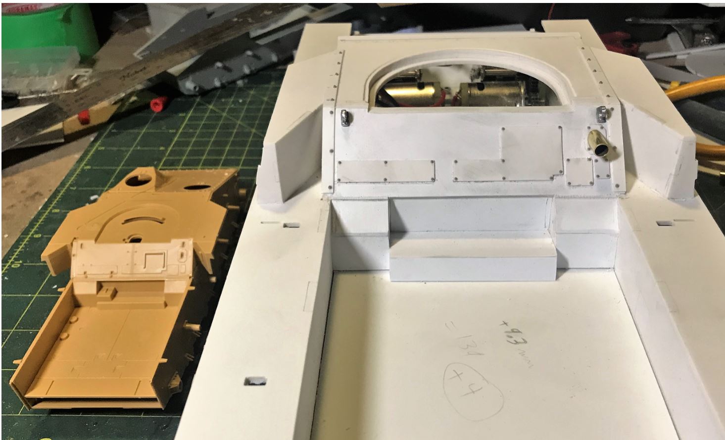 Then a 2mm plasticard layer is shaped and installed on top for a smooth finish, using Tamiya as reference. The bottom plate is given a small sloped angle. Notice how the floor of the fighting compartment is removable, providing access to the track adjuster. As the central gun platform is fixed, access to the electronics will be though the removable glacis. Not much can be located under the floor at the back other than the battery. I want to put the speakers on the side air vents.