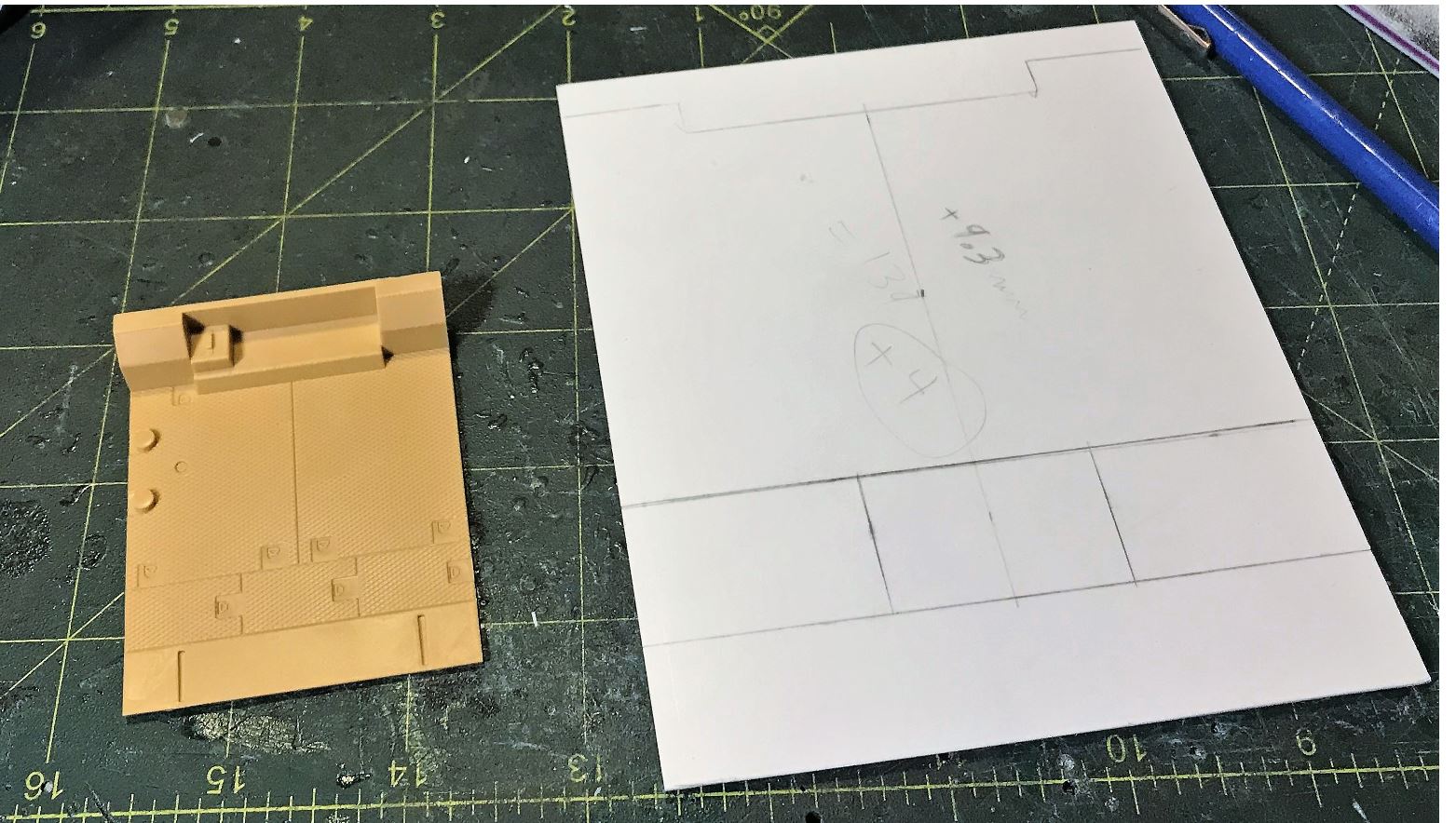 Although a 0.75mm plasticard thickness would have been closer to represent the 10mm of armor, i found it too weak. I opted for a 1mm plasticard, good resistance and which also facilitates the calculations for the required adjustments. To go from 2mm to 1mm plasticard, 1mm was added to the interior sections as the 1mm removed from the armor is given to the overall interior of the vehicle, and as the armor will envelop the fenders, 1mm is removed from them and then given the required angle.