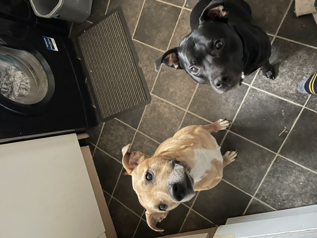 Well, this is Bailey falling asleep in his dinner after a long day on a beach. This is Tilly, probably trying to work out why I look similar upside down. And this is Tilly's twin sister Daisy, sadly she died a couple of months ago from inoperable cancer, at only 13. Bailey was removed from an abusive home and came to live with us. We had his DNA tested, he's 75% German Shepherd, and 25% Staffordshire Bull Terrier, which accounts for his brindle markings.