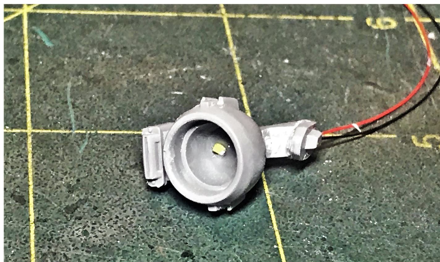 After inserting the wires, the back of the LED is simply glued to the back of the interior, facing forward.