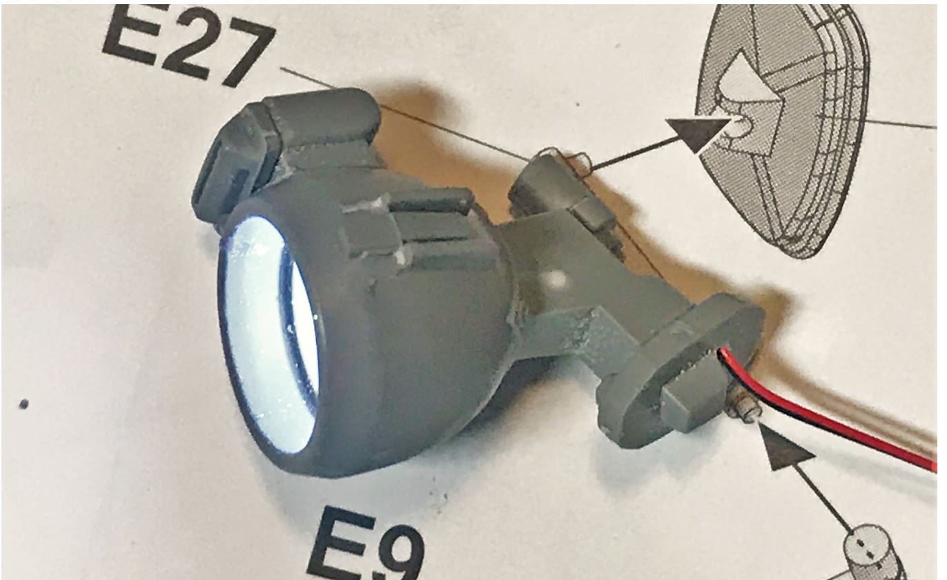 The kit headlights are very nice and are screaming to be equipped with LEDs. I found a way to drill a hole through the mount so that the wires can be totally hidden inside it.