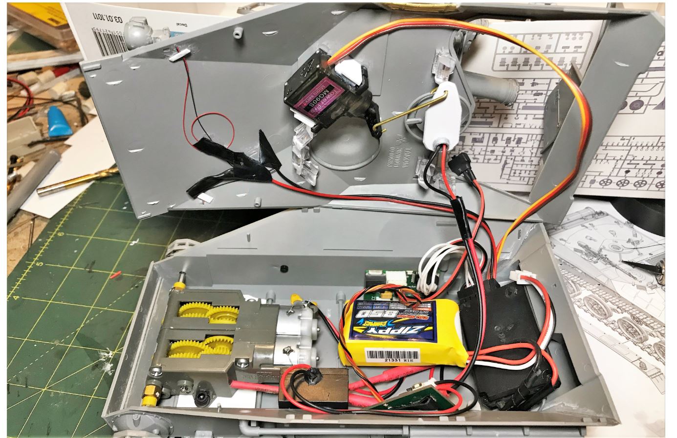 View of the electronics before temporality closing the hull for the testing. Tamiya gearbox, speaker, ACU, MTC2, Zippy Compact 2 cell 7.4V 850 battery, servo for missile launcher rotation and receiver.