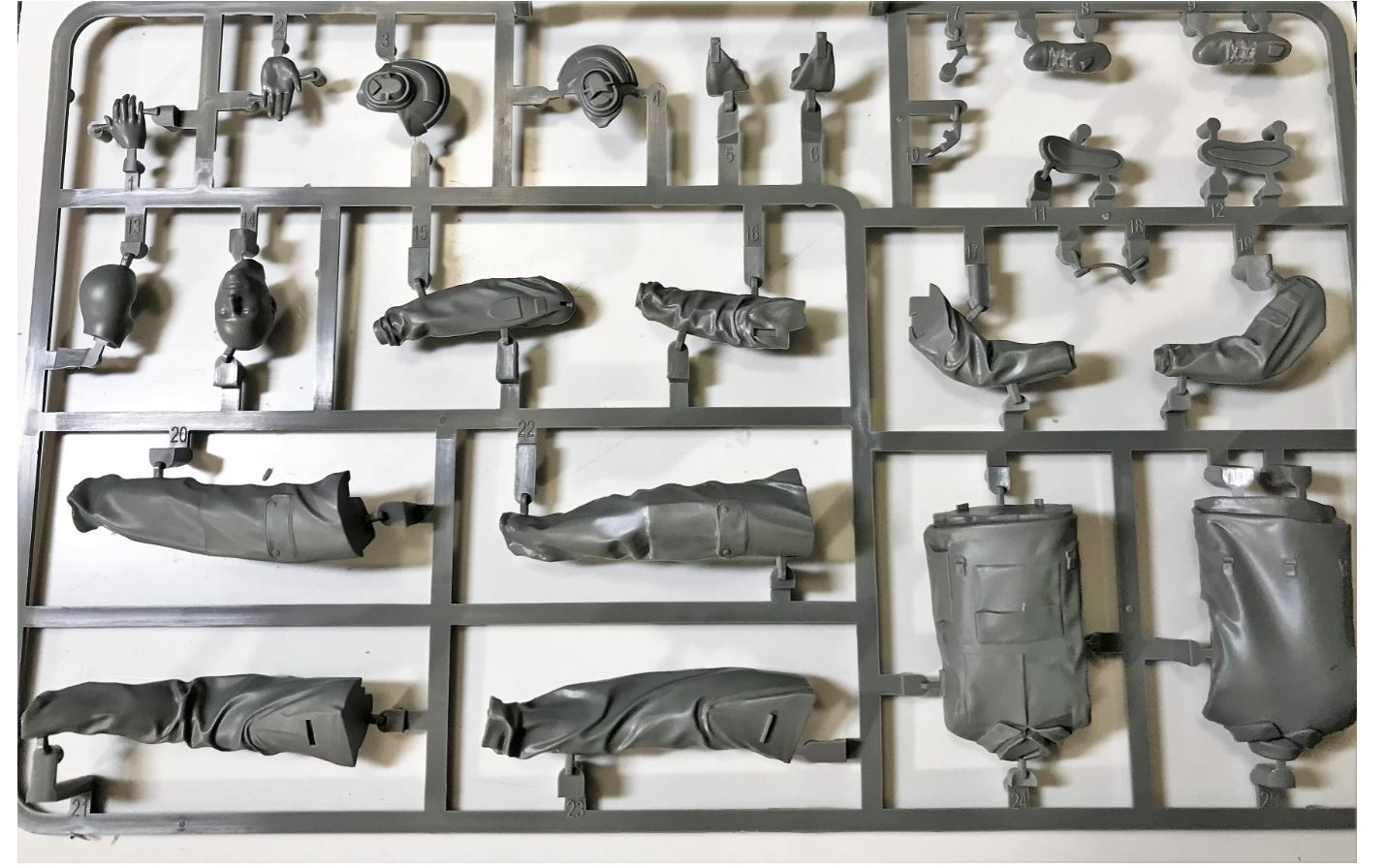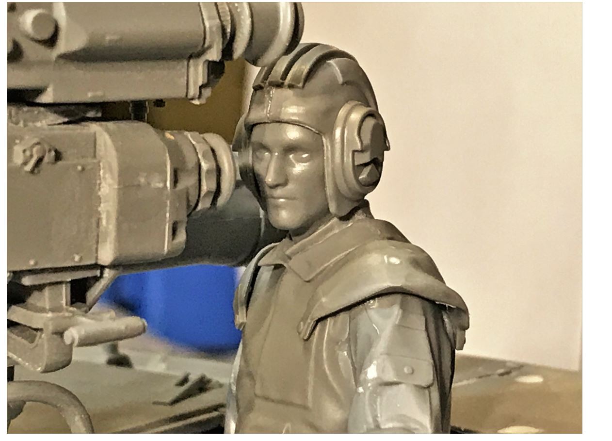 Partially assembled crew figure. The hands and head will be permanently installed only after painting the uniform. The head was put on with a drop of superglue in order to check out the overall face and the fit.