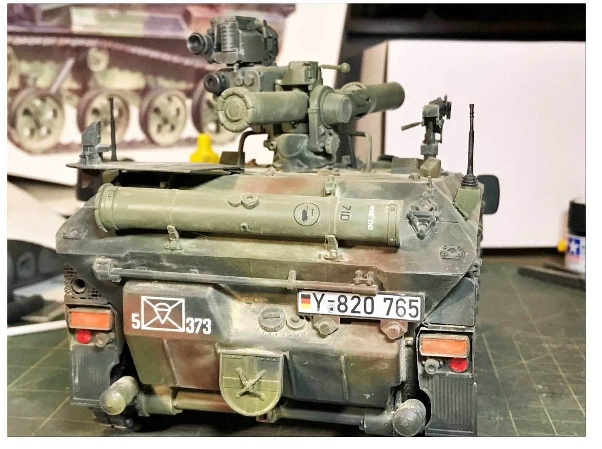 All Wiesels are pretty much painted in the same 3 color camo style in use in the Bundeswehr. The Takom painting sheet is very hard to read, all explanations are typed in characters that are way too small. It seems to propose all kind of exotic MIG color variations of the basic Bundeswehr 3 color camo. I use the paint colors i had on inventory, mainly Nato green, Nato black and Nato brown... Can't go wrong with that. The TOW launcher was later found to be painted Olive drab in real life and was repainted.