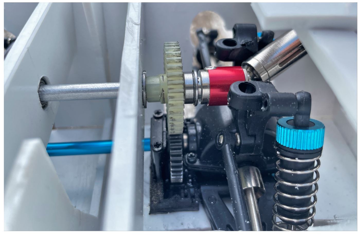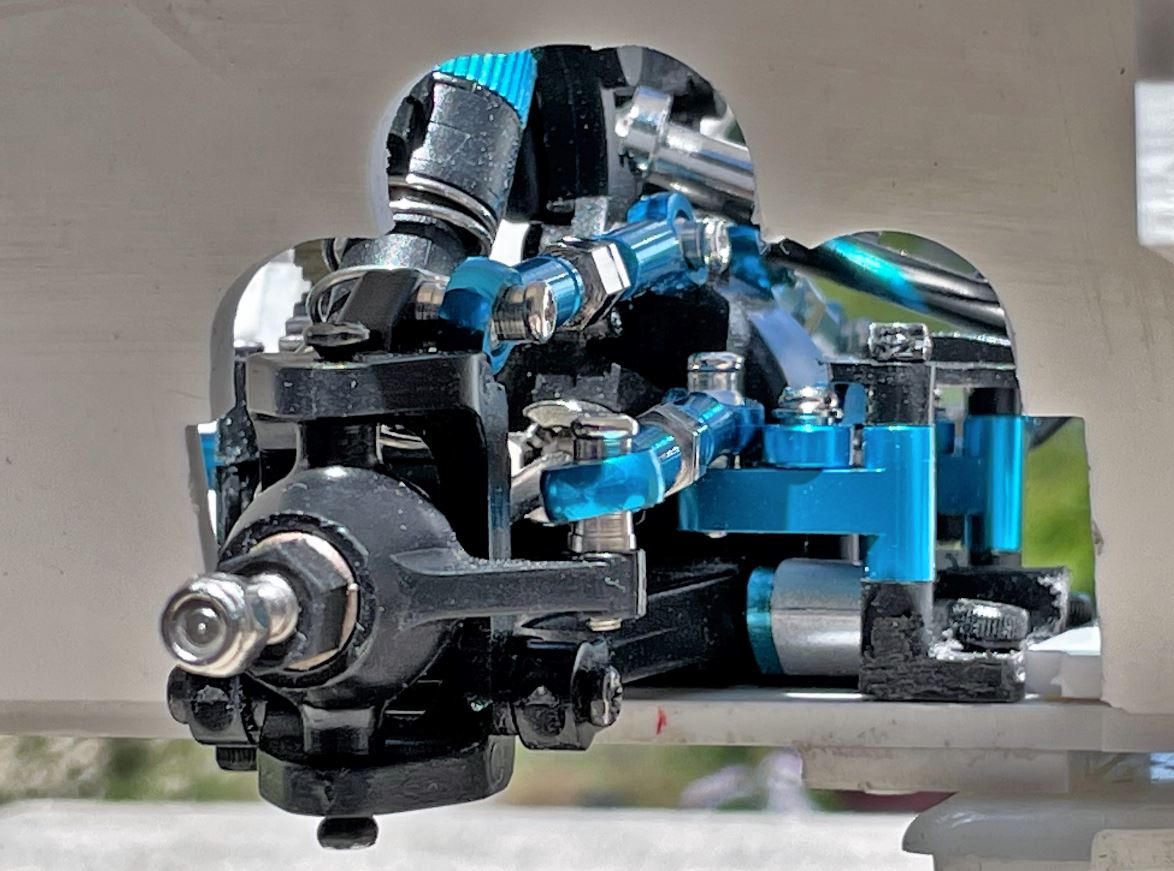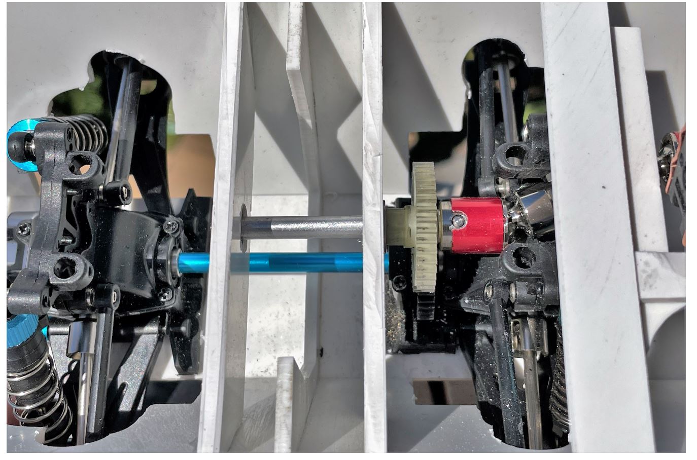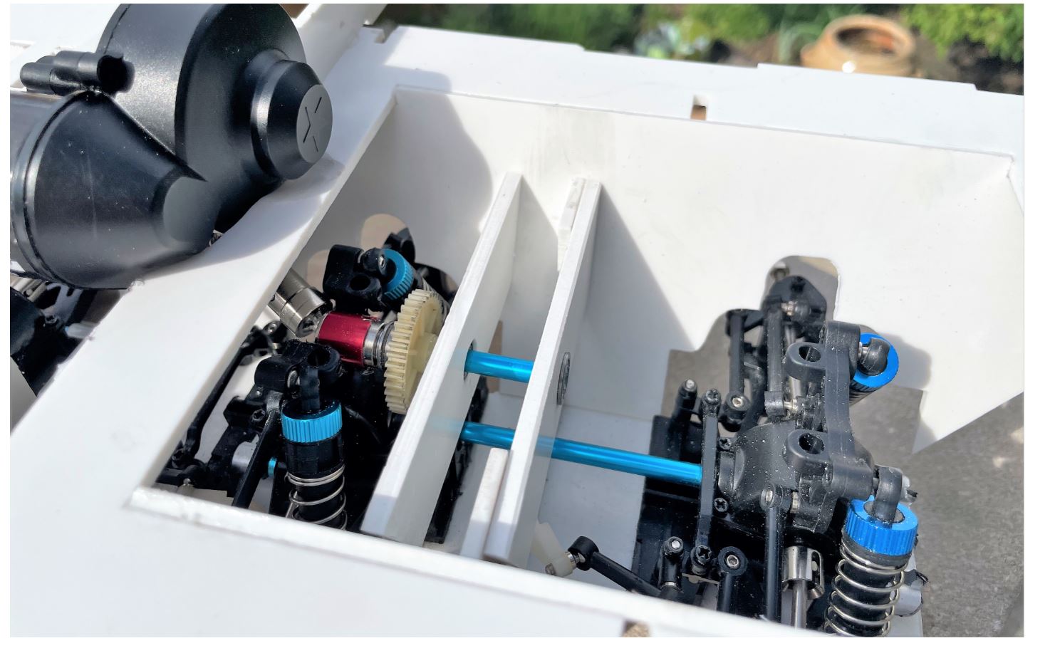 Overview of the steering solution. Each steering module has its own regular size servo connected to a push rod, both are working in tandem with a Y connector to channel 6 assigned to the VRB knob for driving the vehicle. The gearbox and motor were dismounted for the task.