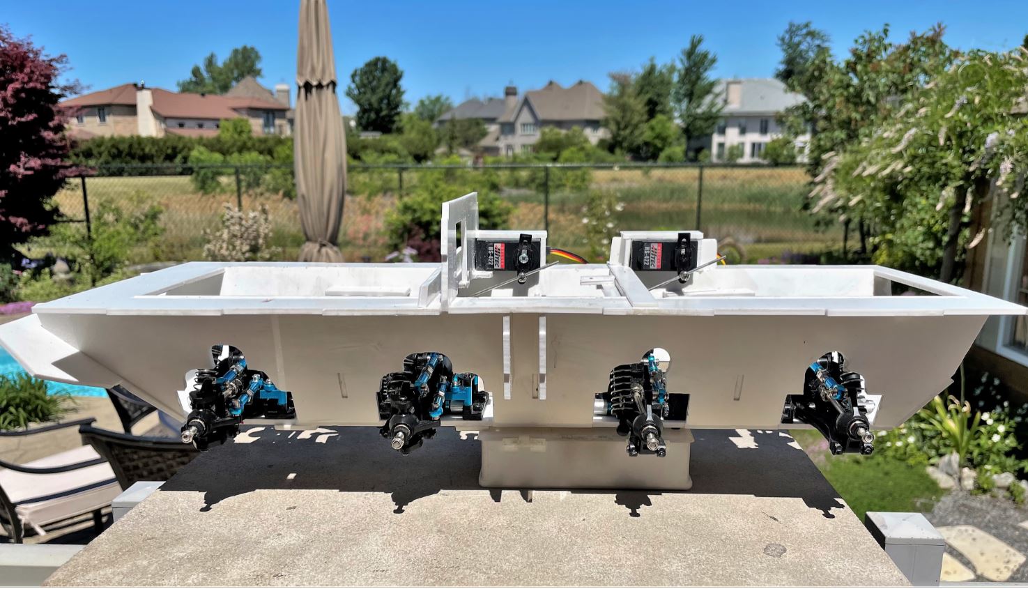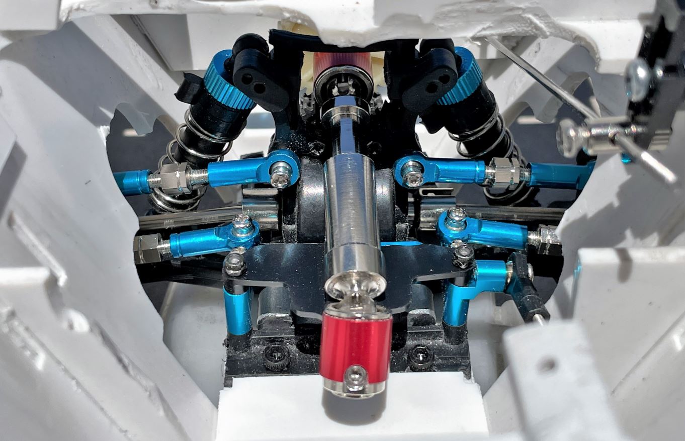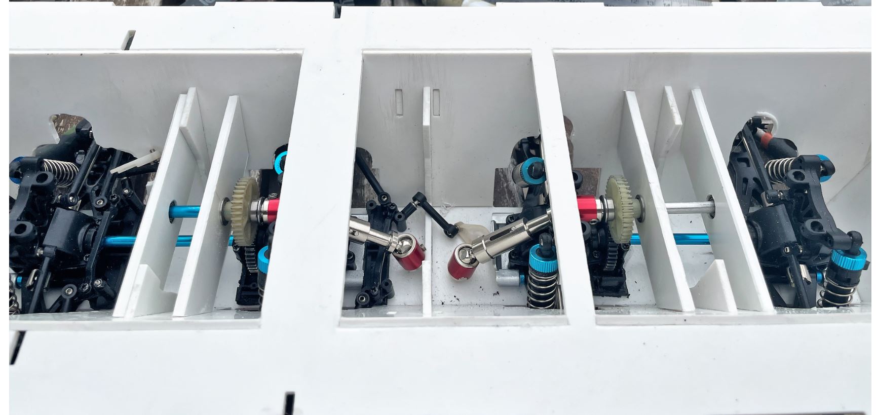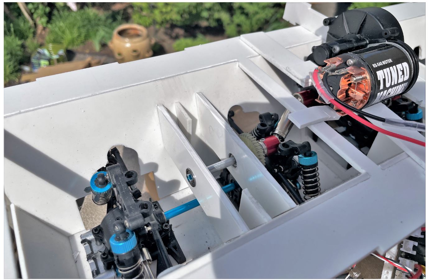 Overview of the steering solution. Each steering module has its own regular size servo connected to a push rod, both are working in tandem with a Y connector to channel 6 assigned to the VRB knob for driving the vehicle. The gearbox and motor were dismounted for the task.