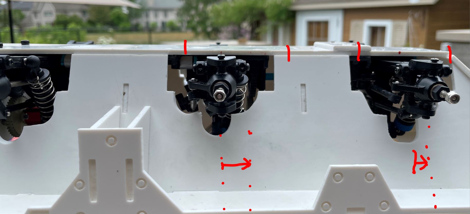Chris did a bad joke on me. I assumed the positioning holes for the suspension were centered with the external body. They are not... I had a small shock when i dry fit the skirts and noticed the misalignment. Very annoying, i had to reposition the suspension module A and B, reinstall them more forward and redo the shaft integration. I few hours of rework. Be warned. Make sure to align the suspension with the skirts first, no assumptions.