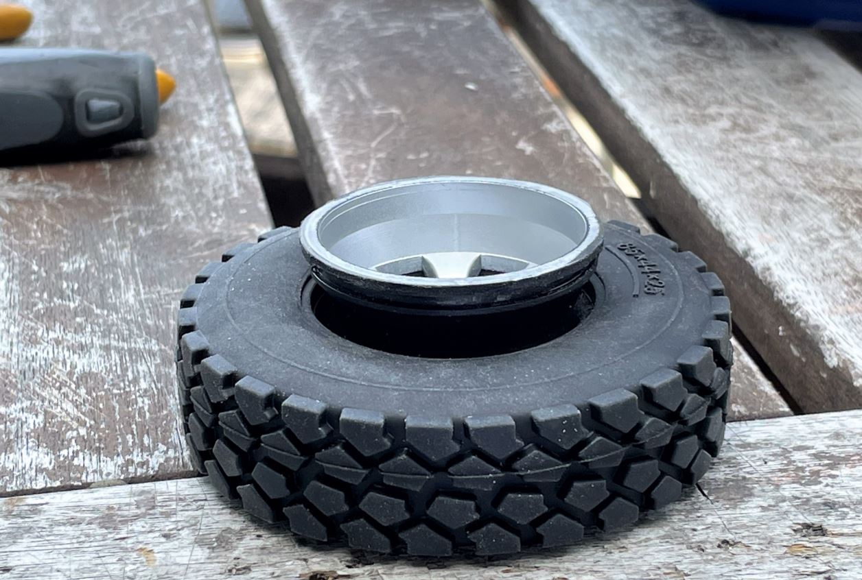 Dry fitting the tires to see if they are of the right size. They look good with the GTK 3D printed hub caps from Ludwigs. Cannot find better matching tires for the price.