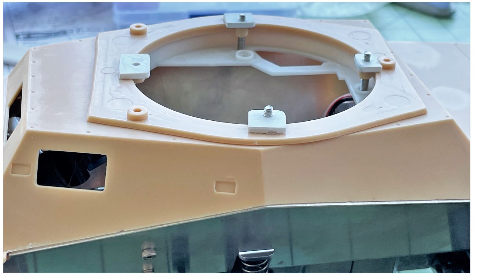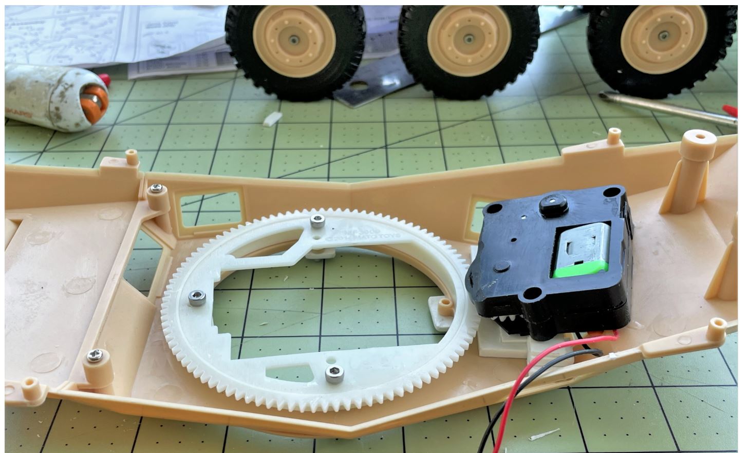 For $20, i could get a standard Mato 360 rotation wheel and a proven Heng Long rotation unit. The size of the wheel is perfect for the Puma, no need for custom size. The attachment points on the turret base are reinforced with a plasticard layer and holes are made for M3 hex bolts.