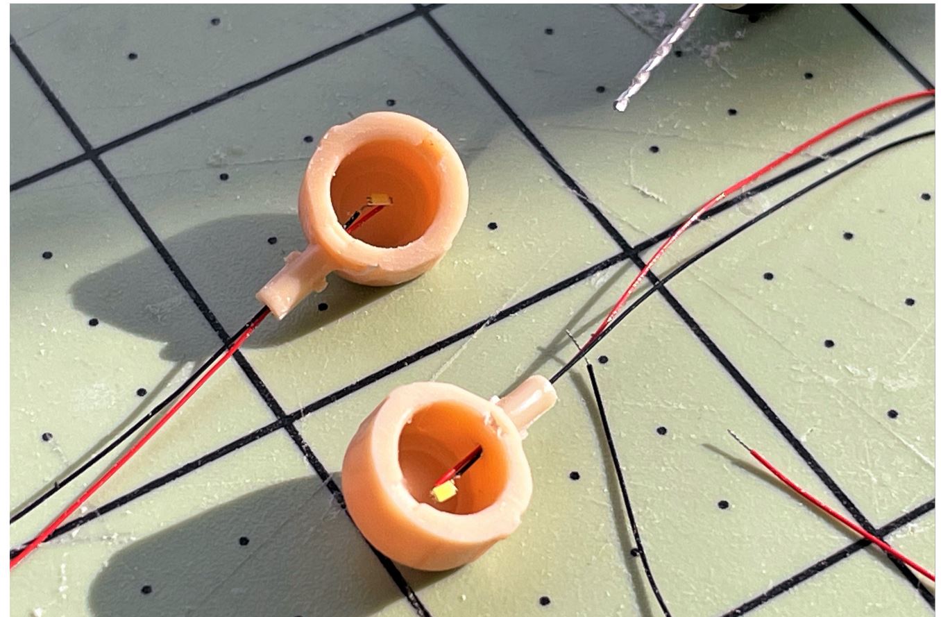 The wires on those LED can't be glued by themselves on the hull for some reason. Need some plasticard bracket.