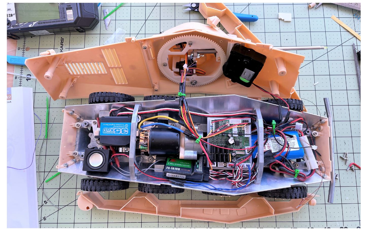 Shown here is the new planned layout of the electronics. Small speaker at the back, receiver on the right side, Clark TK-22 control board in the middle, battery at the front, rotation unit on top of the battery. I replaced the planned TK40 by an available TK22. I need the TK40 for the GTK build.