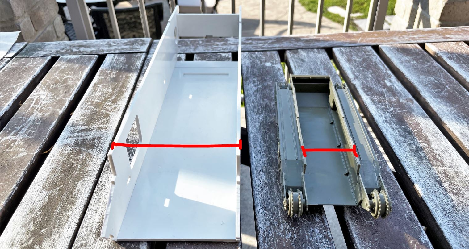 Checking the DKLM tracks on the unaltered Ludwig parts that has sides for track covers. We can see that the DKLM tracks do it fit inside the allocated space inside, meant for Sherman tracks. The elevated section on each sides for the track cover are way too thick. As I will be cutting these, there are no more issues. The width of the main section themselves without track cover are good. I might have to remove 0.5mm in width on the sides of the Ludwig parts as the parts are quite thick. Not sure yet, TBD after the parts are all cut.