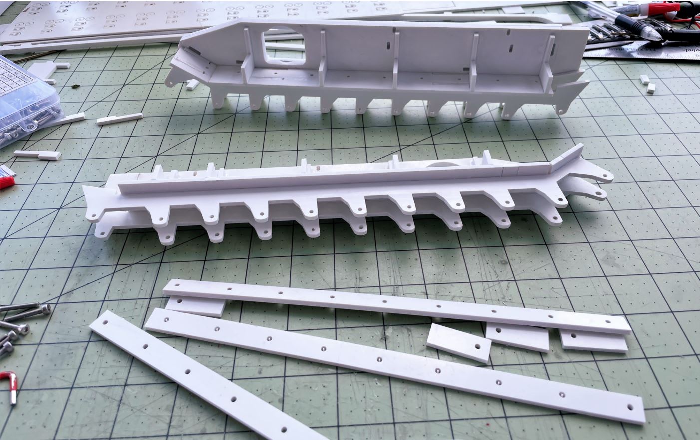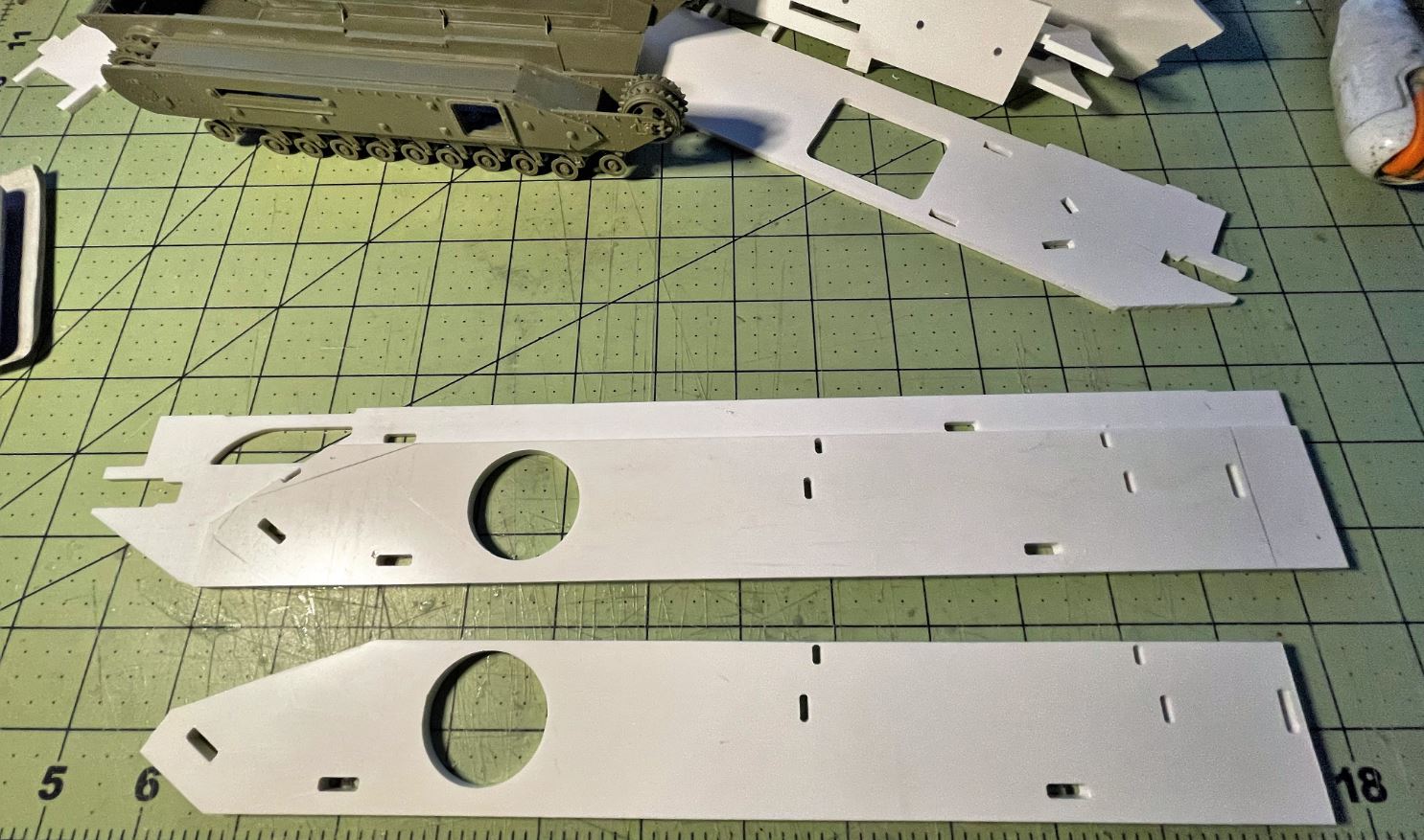 Starting the construction of the panniers. The Ludwig parts for the Mk VII will be salvaged and reused to provide thickness and solidity to the model. Be aware that the pre-drilled location holes for the panniers are wrong. If these were used, the Churchill would be too low on its road wheels by quite a few mm. I therefore recalculate width, length, height, etc of everything on this built according to specs.