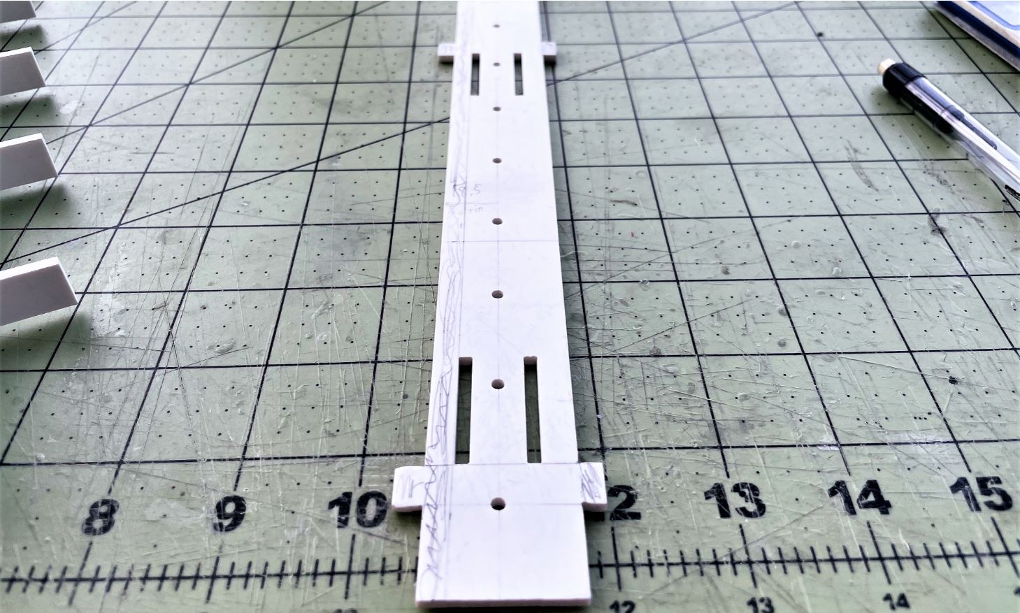 Because i added 2+2mm of overlay on top of the Ludwig exterior part, i am removing about 4mm from the lower center part that is very important because this is where the mount for the suspension is glued to. Be aware that the long rectangular location holes for the suspension mounts are not centered, and this is ok. That part needs to be fully studied and not installed reversed. This step needs a lot of planning to avoid mistakes. The small holes in the middle are for the suspension spring guides.